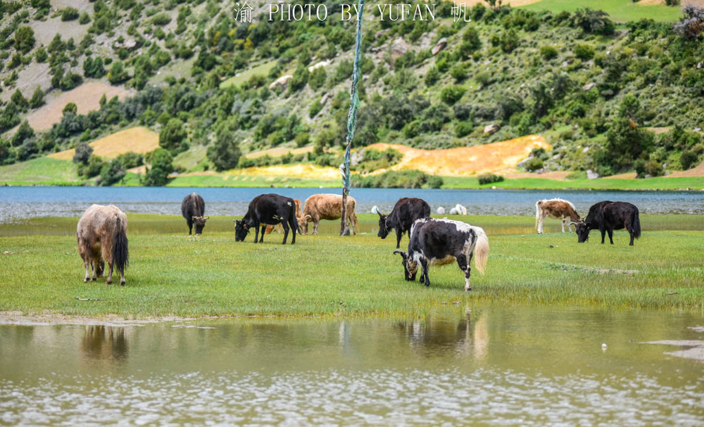 三色湖虽然海拔高度超过4100米,但周边的植被依然十分茂盛,湖里水草丰美,生物资源也极为丰富,不时可以看到有成群的游鱼浮出水面,岸边据说还有盘羊、狗熊、藏雪鸡等珍稀野生动物生活,可以说生态极好,美不胜收。