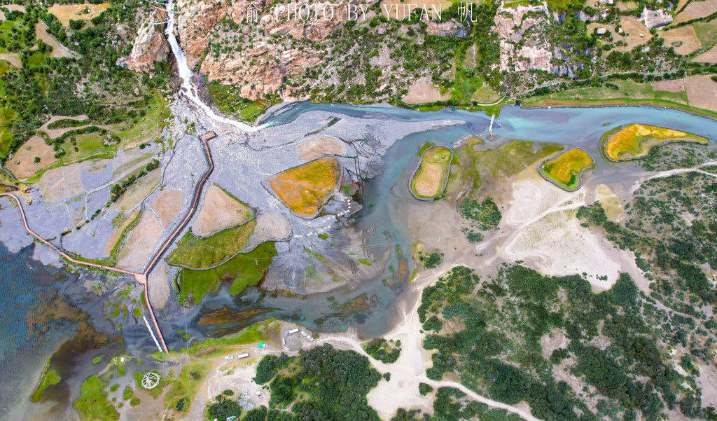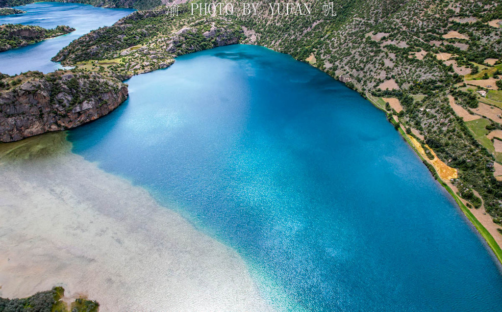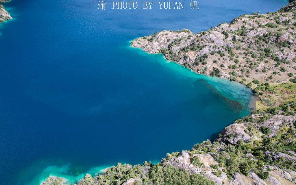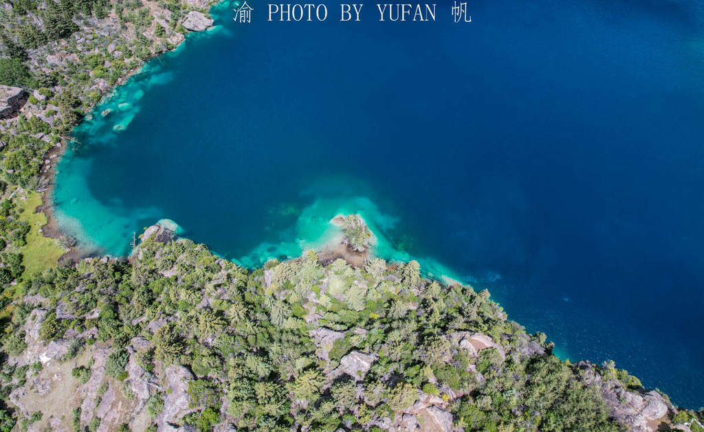 虽然说起来不大,但是我们站在湖边还是看不到三色湖的全貌,好在现在有无人机,当我们升至300米的高空来俯瞰三色湖,会发现黑湖呈“Z”字形,依山绕行。黑色岩石山体直浸湖底,水深幽黑,因而得名“黑湖”。