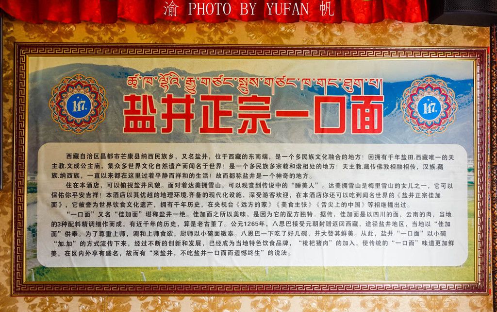 据当地朋友介绍,一口面是以四川的面、云南的肉,加上芒康的多种配料精心烹煮而成,相传800多年前,创建八思巴文的藏传佛教第五代祖师八思巴接受元朝封赠之后返回西藏,在途经盐井地区时,当地便是以加加面供奉的。