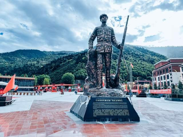 雀儿山下十八军英雄纪念雕像 岗托镇红旗广场纪念碑在诸多进藏公路里,往昌都的317国道这一段修得最早。同时,也最难修。这其中亘横着高耸入云的雀儿山,风冷呼啸的矮拉山。“金珠玛米之路”听起来是那么的诗意而美好,然而十八军当时征服雪山峡谷之时,却时刻伴随着悲壮的流血与牺牲。这条路为顺利解放昌都乃至整个西藏起了关键作用。