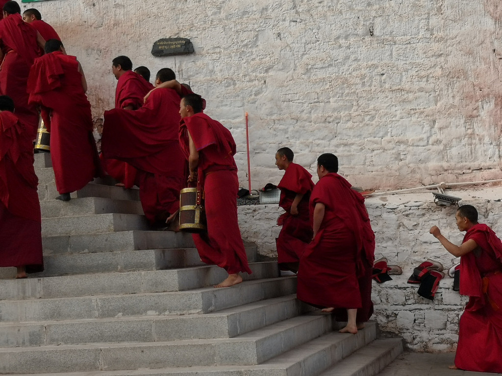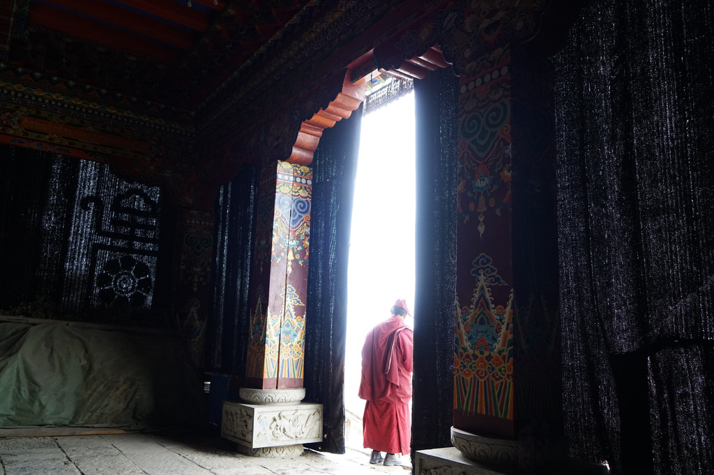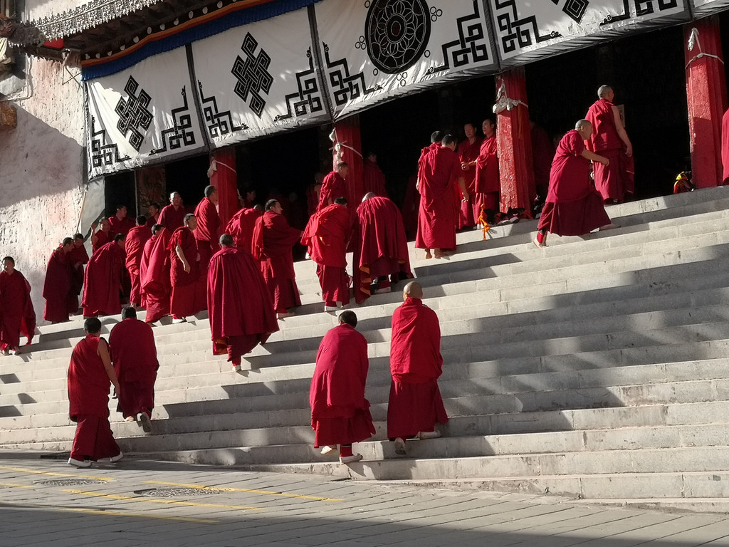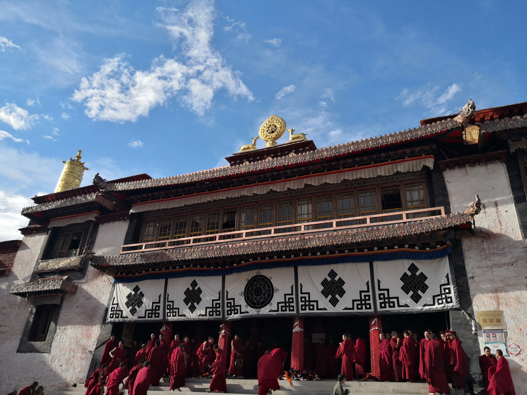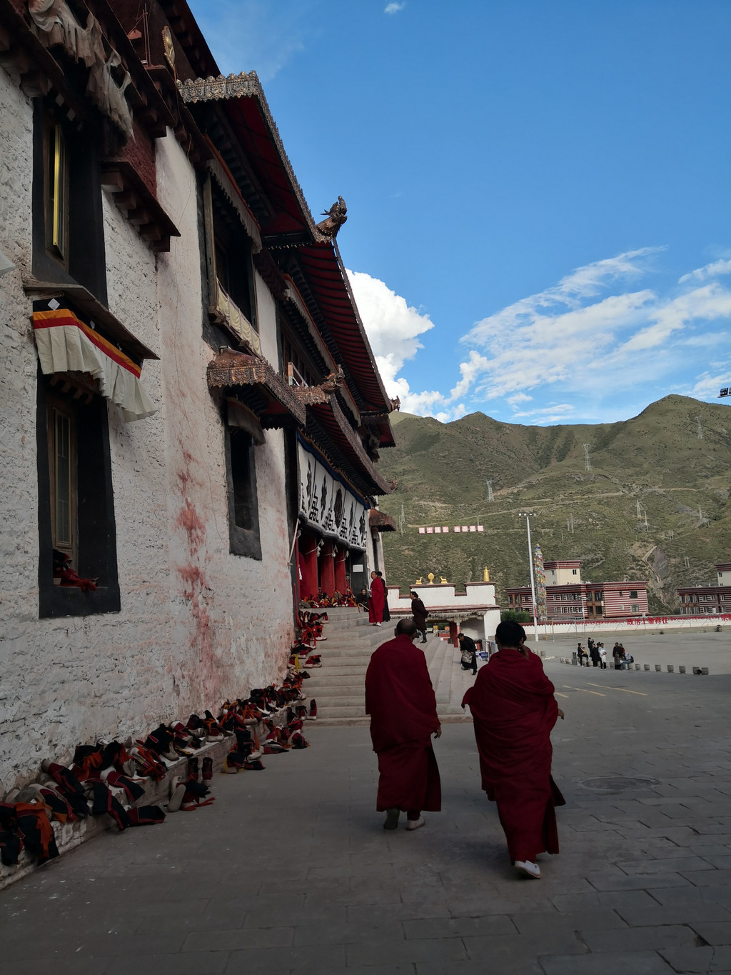 这里有着西藏最大寺庙之一:强巴林寺,我们到的那天正好有佛事活动,大批僧人在主殿外休息聊天。讲经开始时,僧人们便脱鞋入主殿,殿外摆放着众多同款的靴子,看来他们穿鞋是不分你我的。