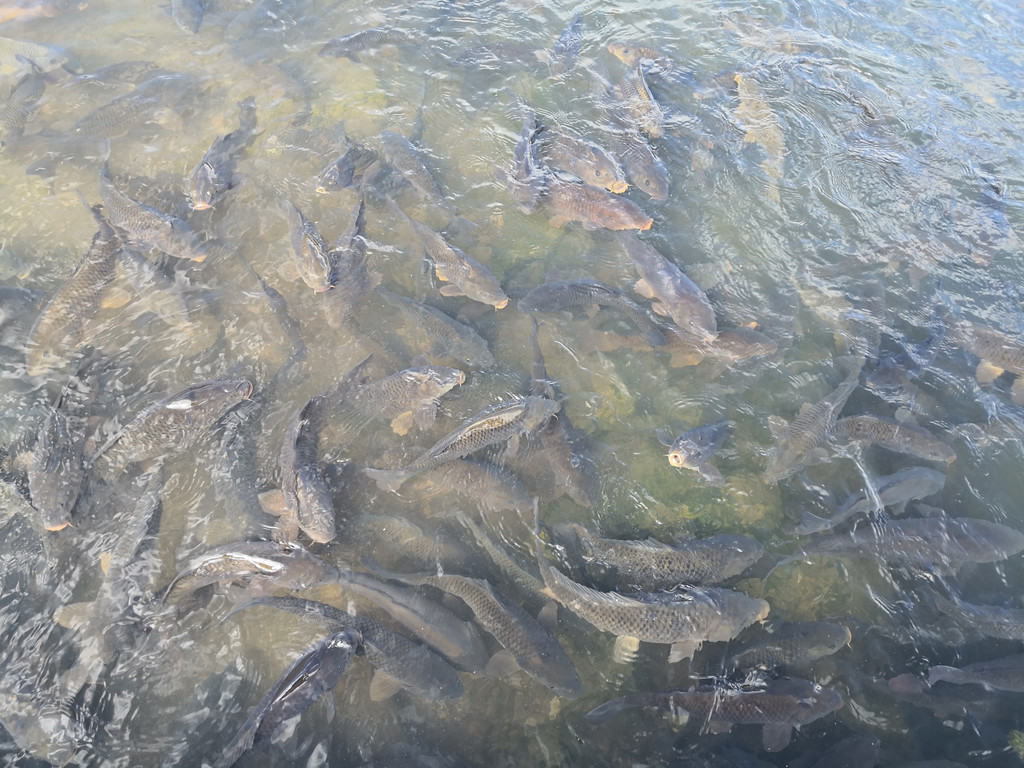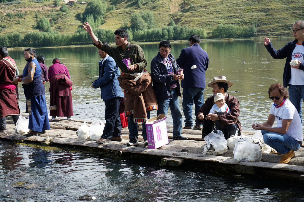 这是个高原淡水湖泊,每天都会有许多当地的藏民一箱方便面或是一袋馒头,一边念经一边投食,在他们的呵护备至下,湖面上鱼儿都挤满了
