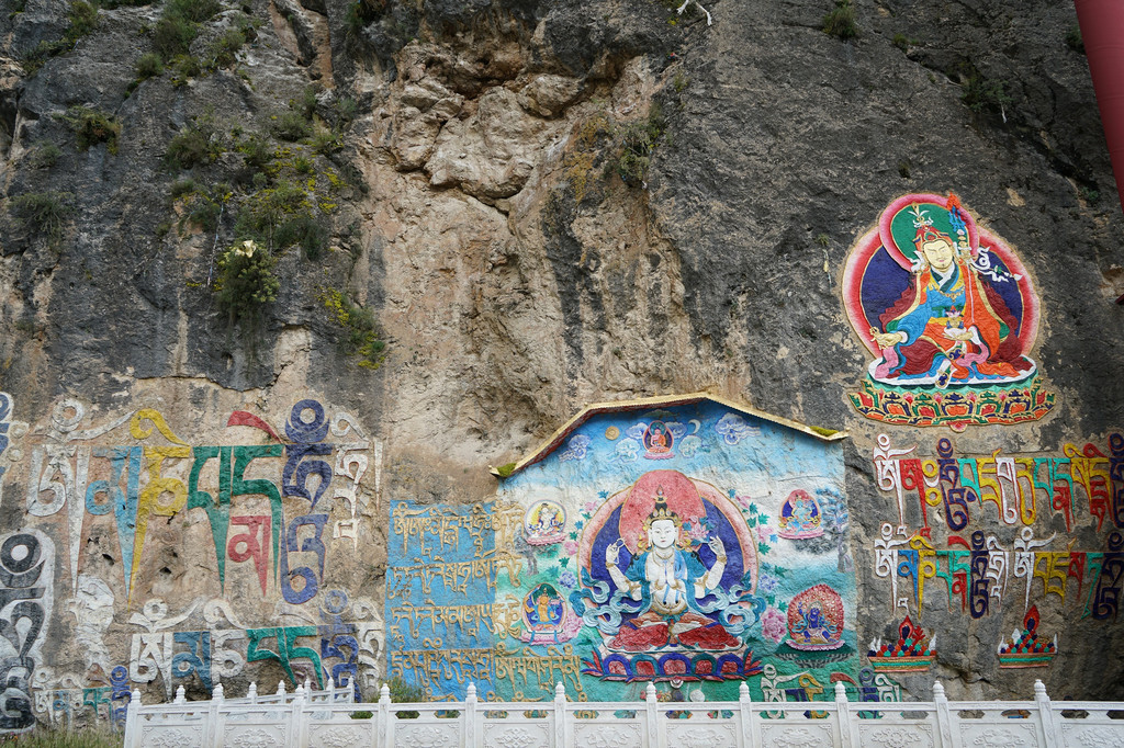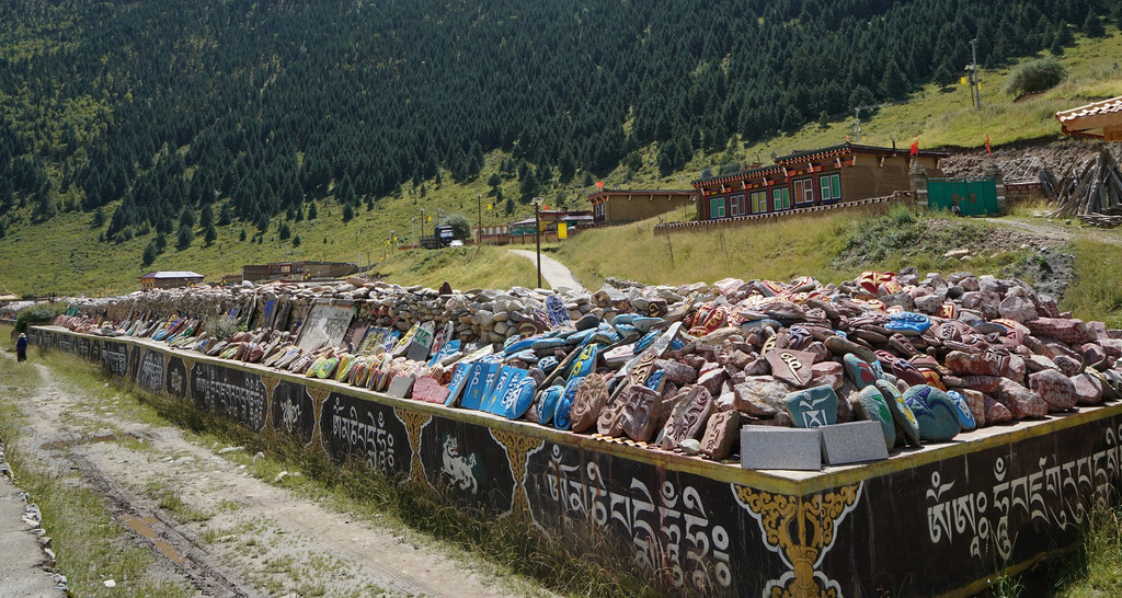在靠近寺庙的路上有玛尼墙,这是信徒们在石上一锤一凿刻上经文,再一块块垒上去后逐渐形成的。