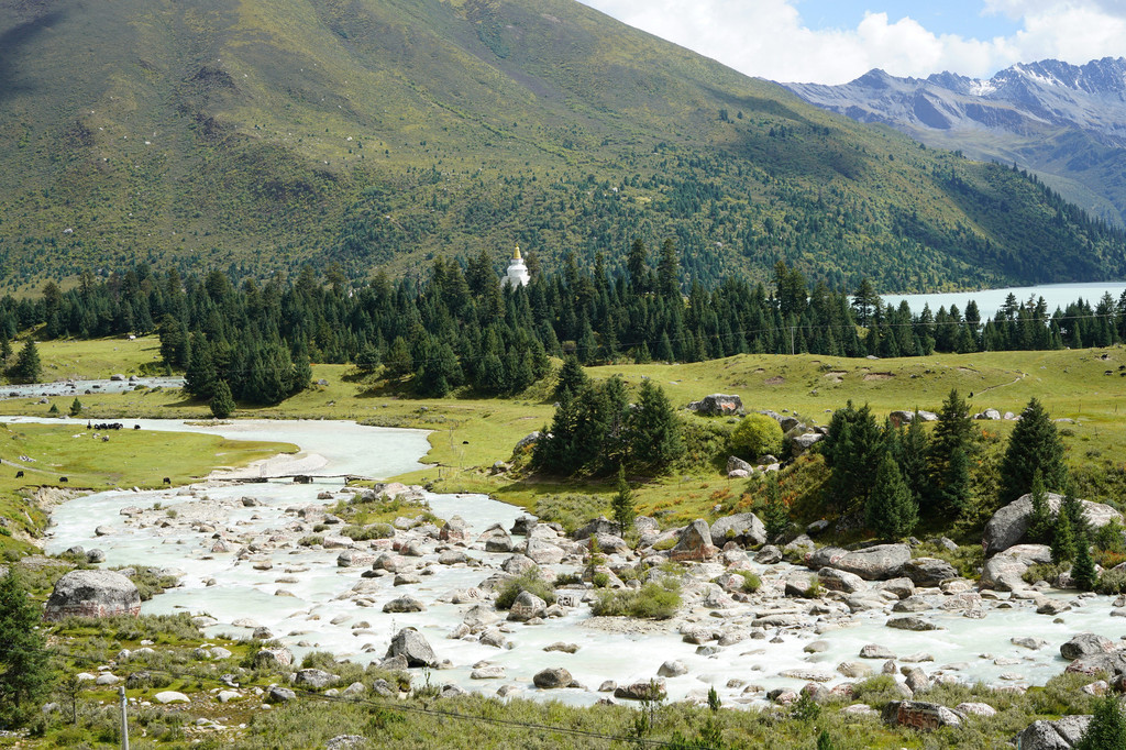 翻过雀儿山, “新路海”就在眼前,这是四川海拔最高、面积最大的冰川湖。可惜景区关闭,工作人员看我们老远赶来却不能进景区,告诉我们上山在小卖部附近有个最佳观景点,内心还是得到了安慰。湖水冰清如玉,四周环绕着森林和草原,一条溪流蜿蜒而来,轻轻拍打着带着经文的石头。