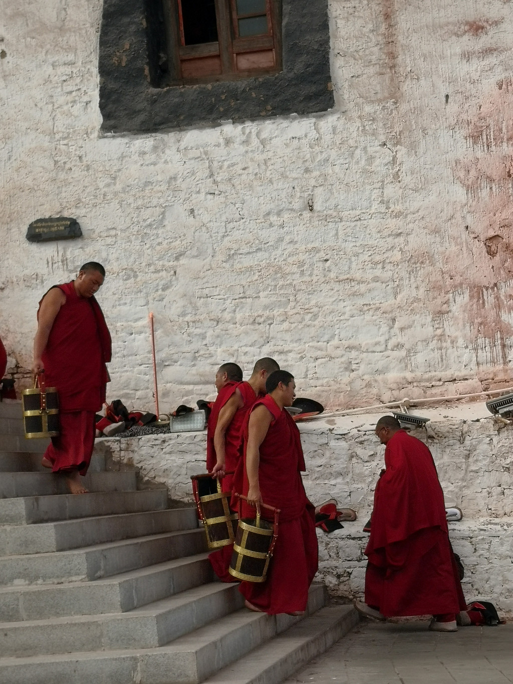 不一会儿僧人提着粥桶再次涌入,没十分钟又提着空桶出来,全程都是光着脚,兴高采烈。