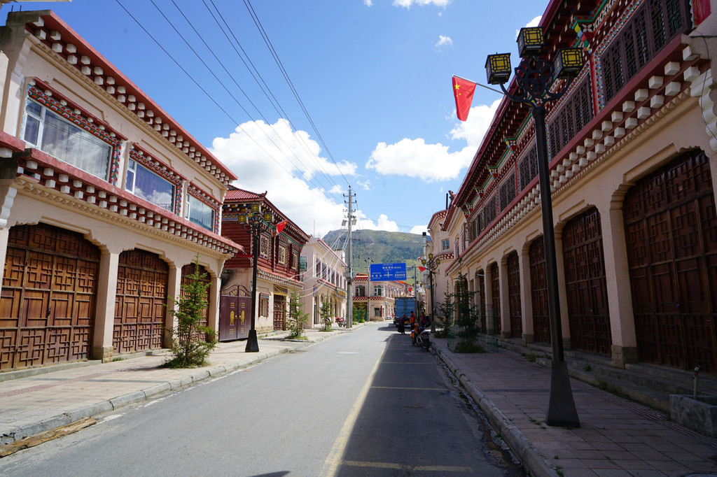 马尼干戈藏意是“雕刻玛尼石的地方”,这个小镇就一条主街,房子也气派,可是大中午的,街上竟然没几个人,大概就是传说中西部风情的味道吧。