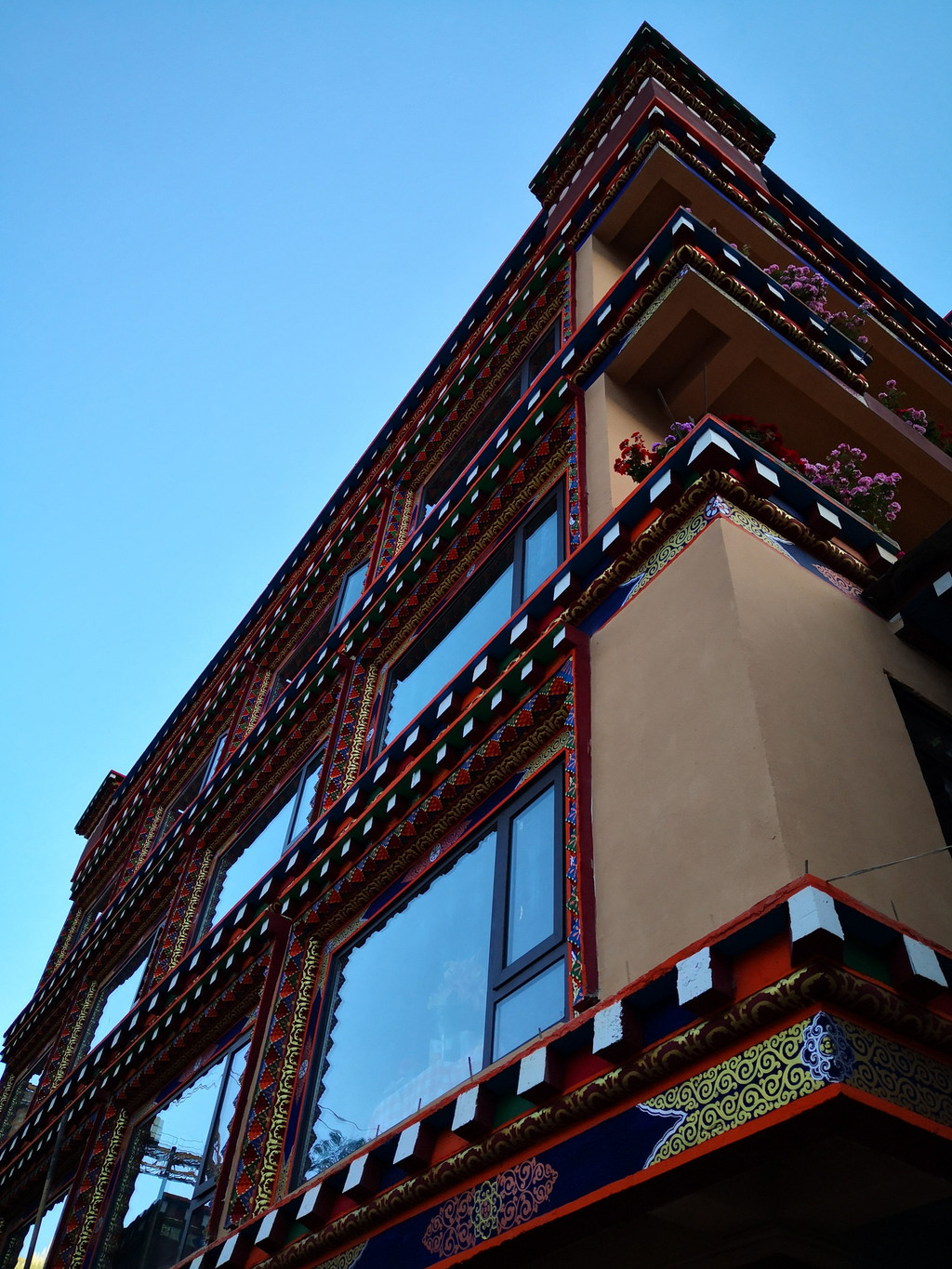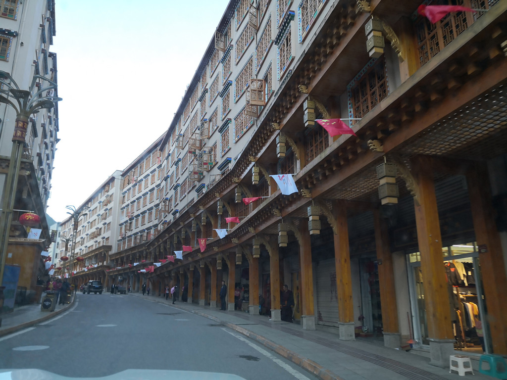 德格县城建在狭长的河谷上,街道不宽,有意思的是竟然也有骑楼,精工细作,极具藏族特色。