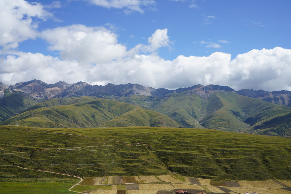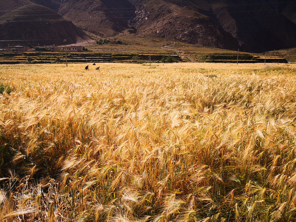 进入日喀则地区,能看到平缓的河谷平原,路边大片的青稞地,正是收获的季节,微风下是金色的海洋。