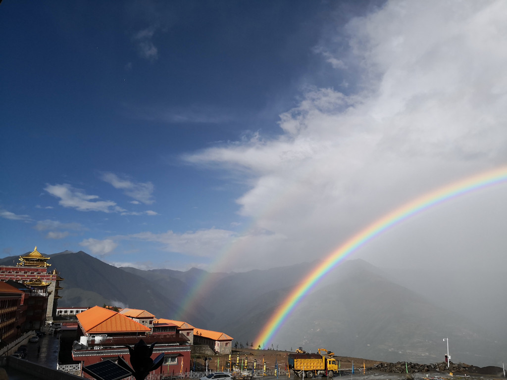 突然一阵大雨,躲在庙中没几分钟天气就放晴了,还出现了彩虹。