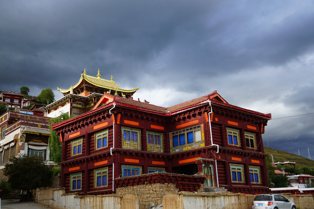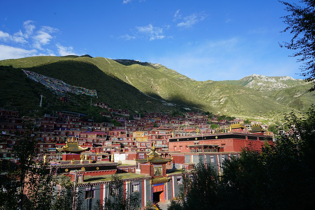 过了更庆寺,就可以看到山坡上密密麻麻的红色小木屋,那是僧人的住所。