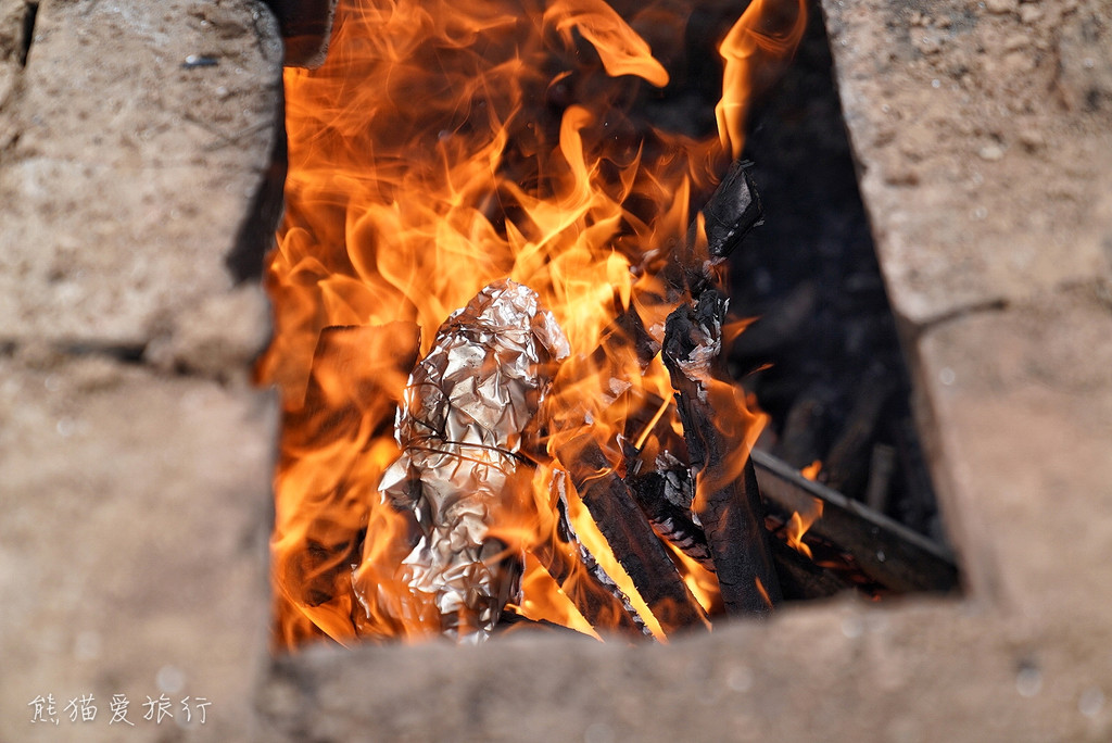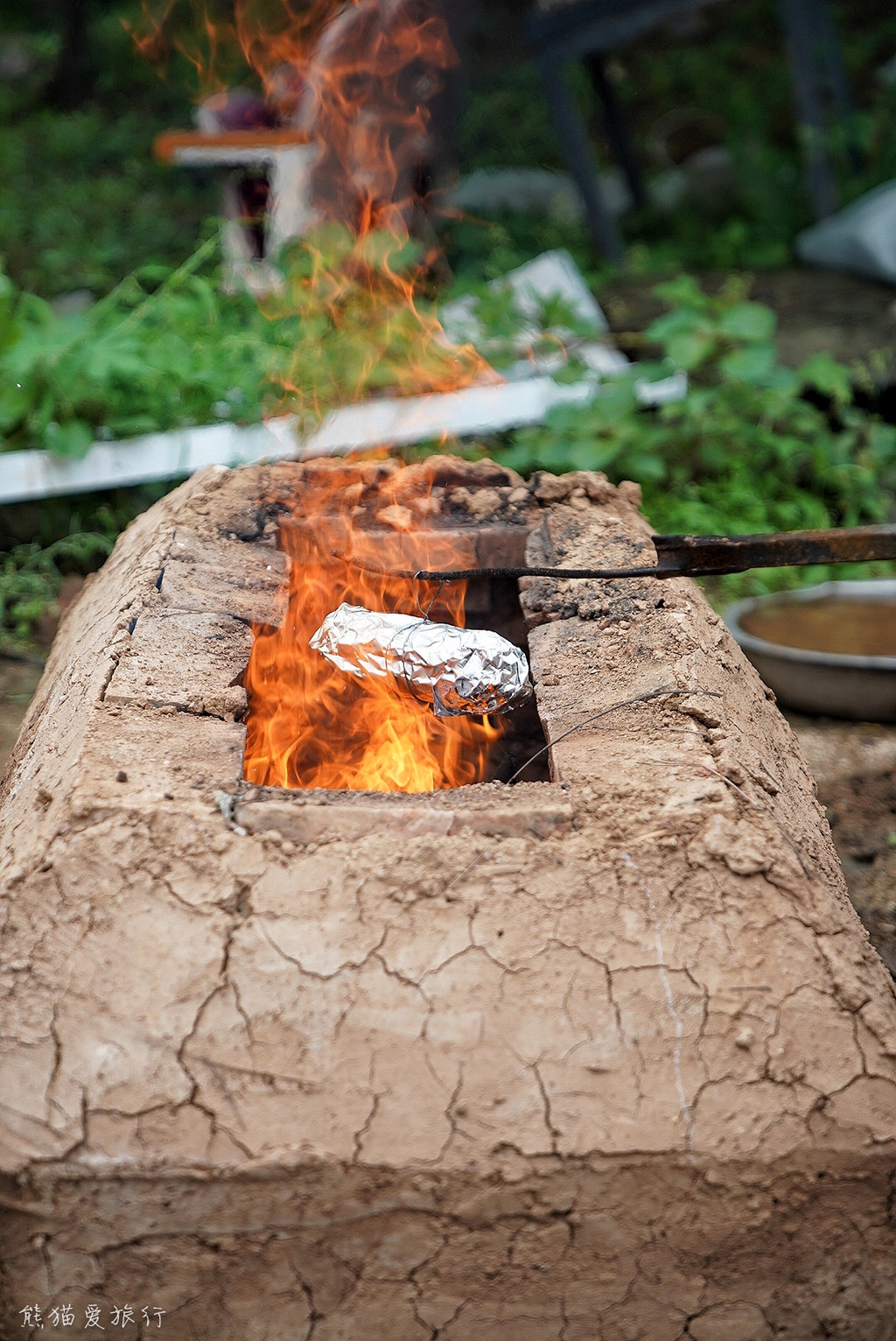 坑里烤肉是老板的叫法,因为老板特别在后院小菜园里手作了一个土灶烤炉,提前1天腌制好烧烤食材,让烤物充分入味,从山野间采集来核桃木和板栗木做烧烤的木材,烧旺火,之后把食物小心包裹在锡纸里放入烤炉。有木有一点武侠小说里豪华版叫花鸡的既视感?只不过,除了叫花鸡,还有各种烧烤美味。