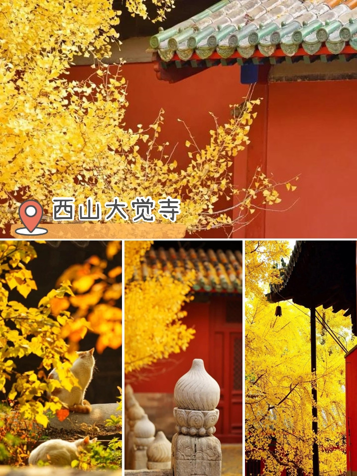 西山大觉寺:大觉寺始建于辽代,景区较为小众,环境非常幽静。院中有几株树干粗达数人才能合抱的千年银杏,秋季金黄的银杏叶配上历史气息浓厚的庙宇红墙,古朴优雅、绝美至极。