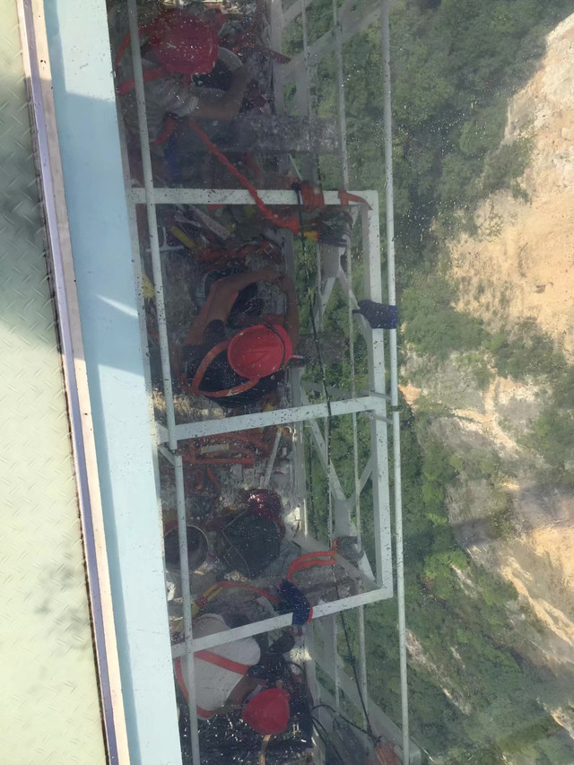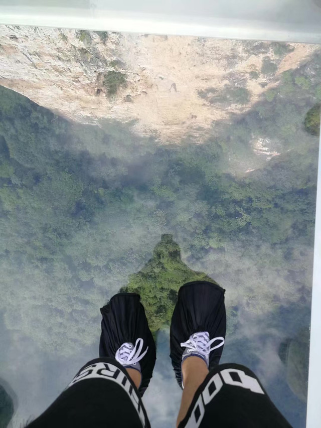 从天门调到山顶是可以坐扶梯的,这段扶梯免费乘坐,但足有七段,所以竖个过程显得有些漫长,但肯定是比爬轻松多了。 山质空气清新,风景格外的秀丽,沿着西线走,就能走到西线玻璃道,收费五元,需要套上鞋套行走 现场会有发放,盘龙的钱语相对短,并且可能修 建得早些,所以玻璃地面有些花了,透明度不高。