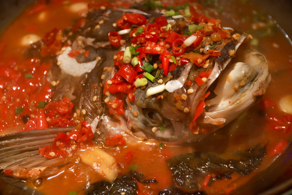 这是他家必点招牌菜,集拍照&下饭为一体的神器!一只超大的鱼头置于锅内,锅内有提前熬好的汤底,鱼头上洒满剁椒,闷上10分30秒,一开盖香气喷涌而出,绝对的硬菜!