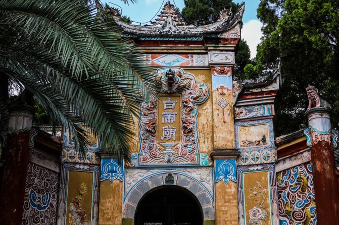 为什么说有一种幽幽的美呢,不知道是因为天气的原因还是白帝城自带BGM,这里总有一种莫名的幽怨感,在炎热的天气里总觉得身边围绕一丝寒意,特别是在这片榕树林,榕树相互缠绕千丝万缕,构成一片阴凉,树上包裹的麻绳上有彩绘的仙气飘飘的人物角色,风吹过树上的姻缘牌,同心锁碰撞发出声音,不禁一阵寒颤,其实树中间还有一座空的花轿,摄影师是小怂怂不让它入镜。但这些物件搭配在一起又很和谐,让你忍不住驻足品味。所以我说是种幽幽的美。