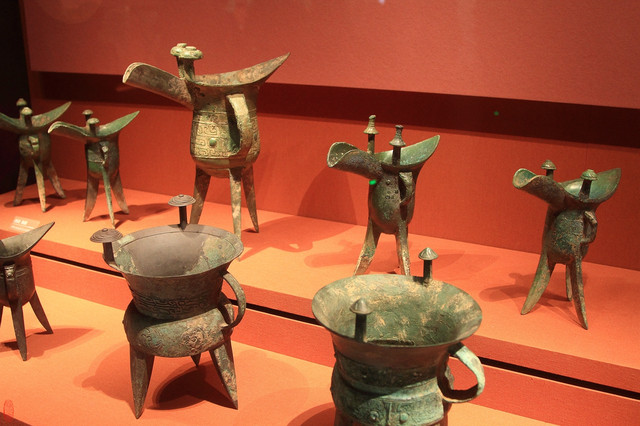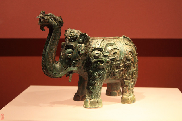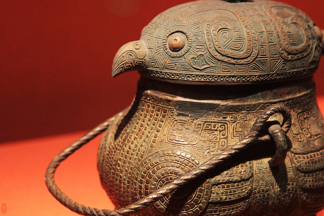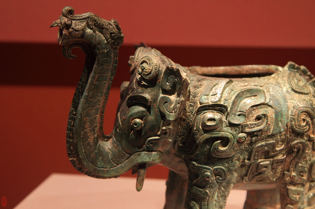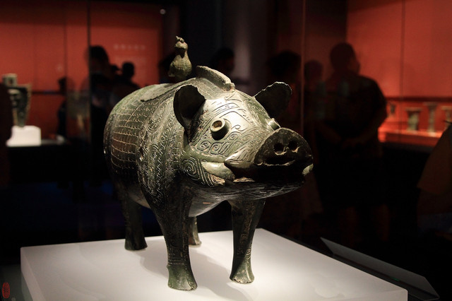 豕形铜尊:尊为酒器,猪背上开椭圆形口,设盖,腹内盛酒。商代以豕为造型的酒樽仅此一件