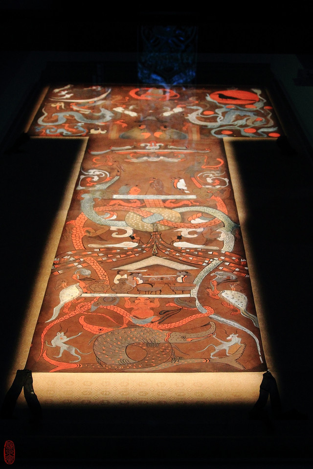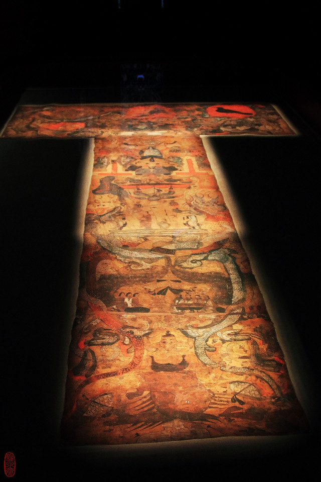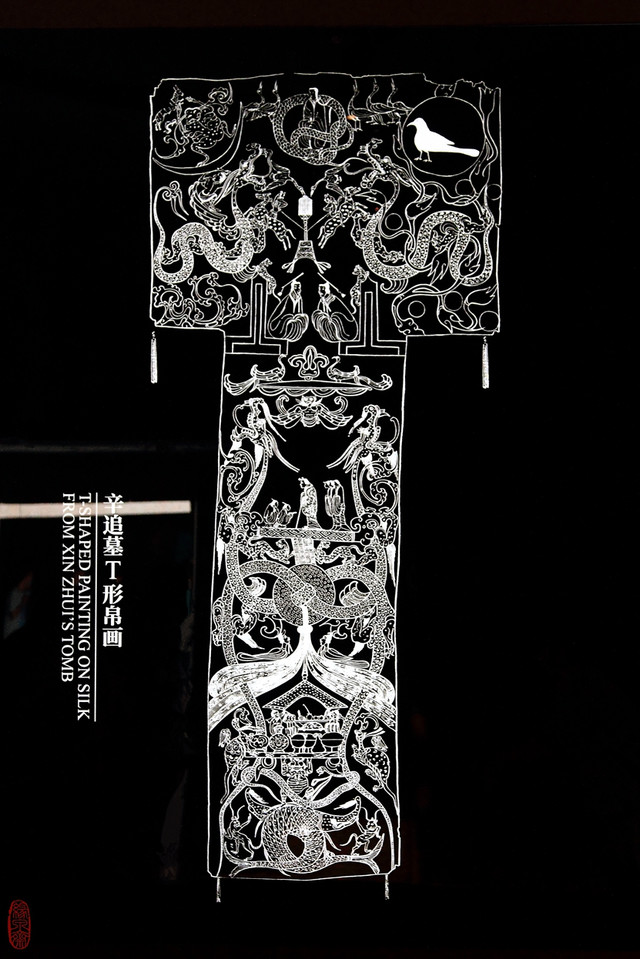 镇馆之宝辛追墓T型帛画:帛画是葬仪中用以表示招魂、导引后随葬的旌幡。分为天上、人间、地下三部分,精美绝伦,这个T形帛画也是收录在《禁止出国(境)展览文物目录》中的
