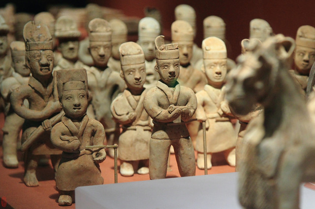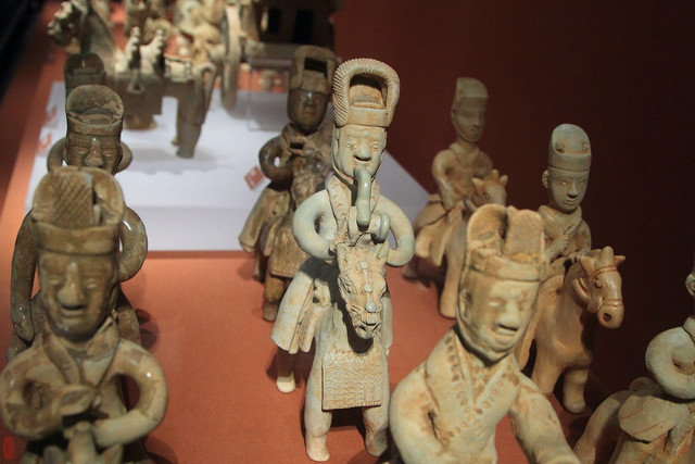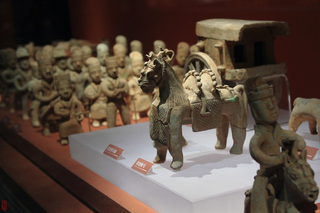 《国家宝藏》说过,马镫最初只有一个,用来上马,后来发展成一对,用来骑马。迄今所见最早的有确切纪年的双马镫收藏在辽宁省博物馆,制作于东晋十六国。最早的单马镫就是眼前这件,湖南长沙金盆岭西晋墓出土了一溜带单马镫的陶瓷马