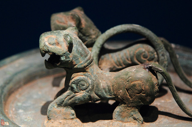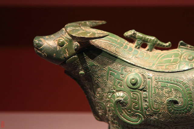 这是一件器形和纹饰都很别致的盛酒器。牛首及背为盖,腹内盛酒。此牛的头部和角形是水牛形象,牛背上站立一虎,既是实用的捉手,又是一种装饰。牛身上还装饰有凤鸟纹、龙纹