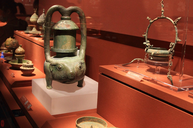 东汉·人形铜吊灯:灯由盘、储液箱、悬链三部分组成