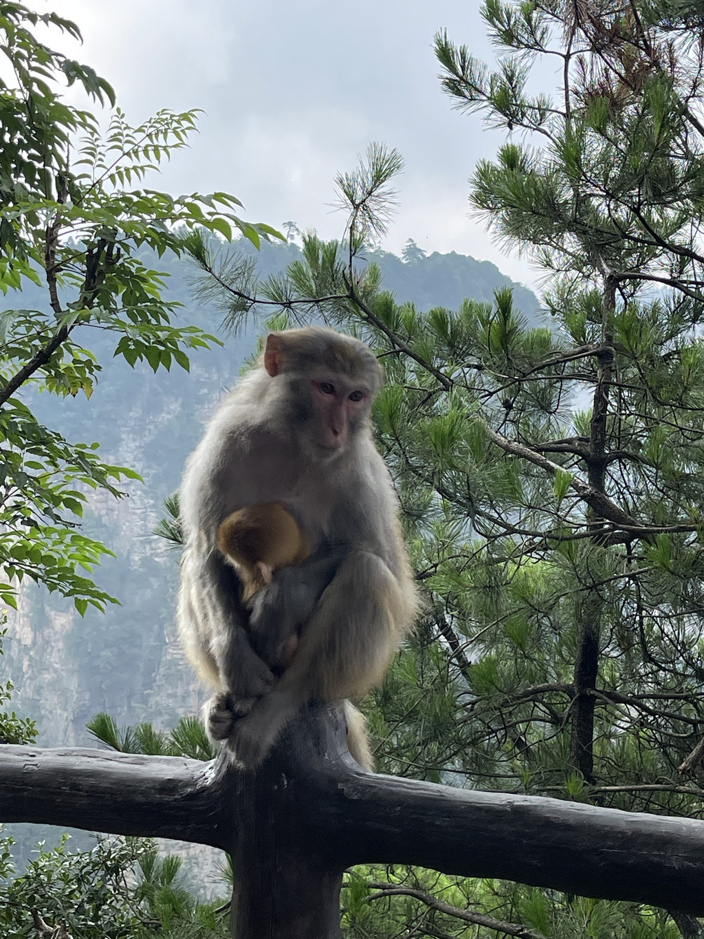 门票要提前预约,预约好时间和进门(我选的武陵源)6:30开门,早点去人少哦。我的票是7:00-8:00的,进去后环保车不需要排队,按照计划,直奔百龙天梯站,排队10分钟后,就上去了,天梯70s,哈哈,每一秒都很珍贵是不是,飞一般的感受是不是。反正电梯引导一口气讲完,电梯就开门了。(电梯分上下两层,同时运行,所以排队的时候可以看看哪里人少,不必非上楼),出了电梯,此处必须强调,一定不要提塑料袋子,最好也别提手提袋,要双肩背最好了,塑料袋百分百被猴子抢走,手提袋也会抢,双肩背它居然还会试图拉开拉索(未遂)。。哈哈,草草欣赏后,请。。上车,环保车到迷魂台(或后花园)下车,袁家界景区游览正式开始,这里几乎是你走到哪里都有外围照片可以拍照,没有遮挡,只要天气晴好,随手就是大片。迷魂台、乾坤柱(哈姆路亚山)、神龟问天、天下第一桥(这个老早就要标识的景点,在后面,放心大胆的走吧走吧),到这里后我们就直奔天下第一桥停车场,前往杨家界(乌龙寨路口站下)。