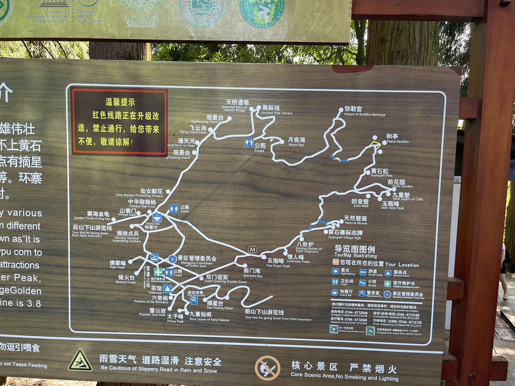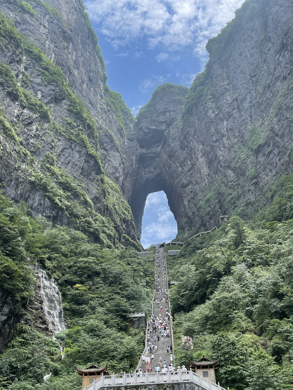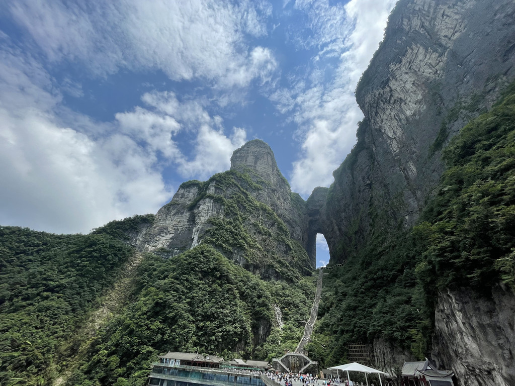楼下吃过早饭,行李寄存,转个弯就到了天门山索道下站,按照预约的时间取票后,排队15min左右缆车上行!我们选的A线,直接从高往低处游览。索道上站到达后,选择西线-天门山寺-东线-七级扶梯-天梯