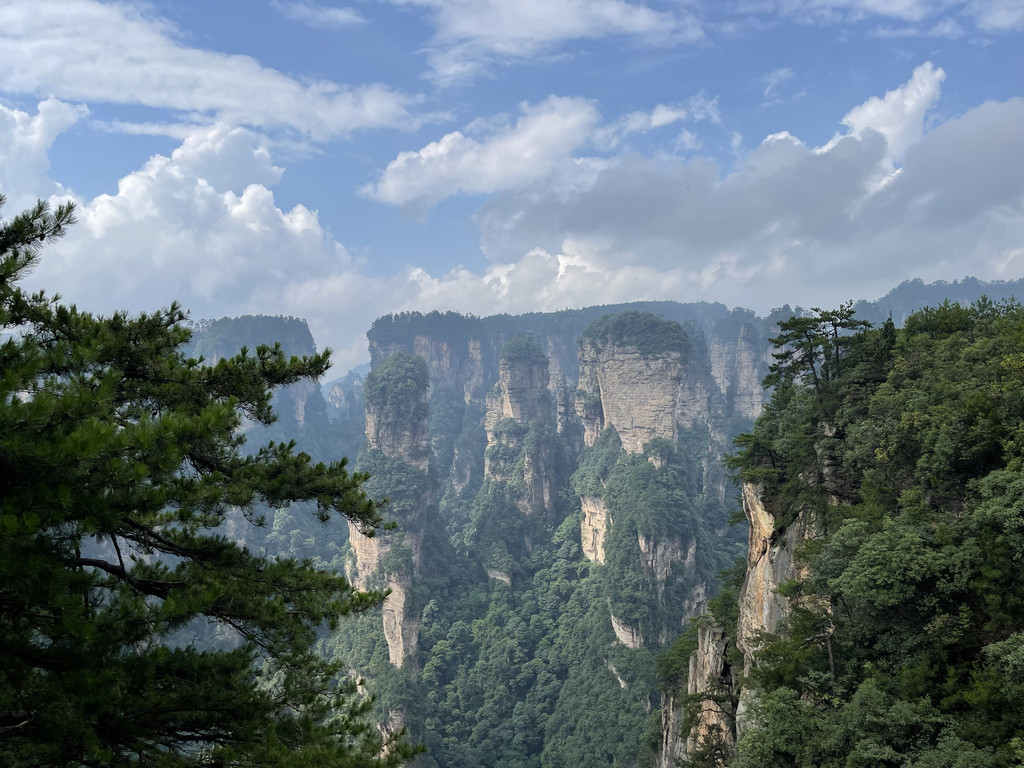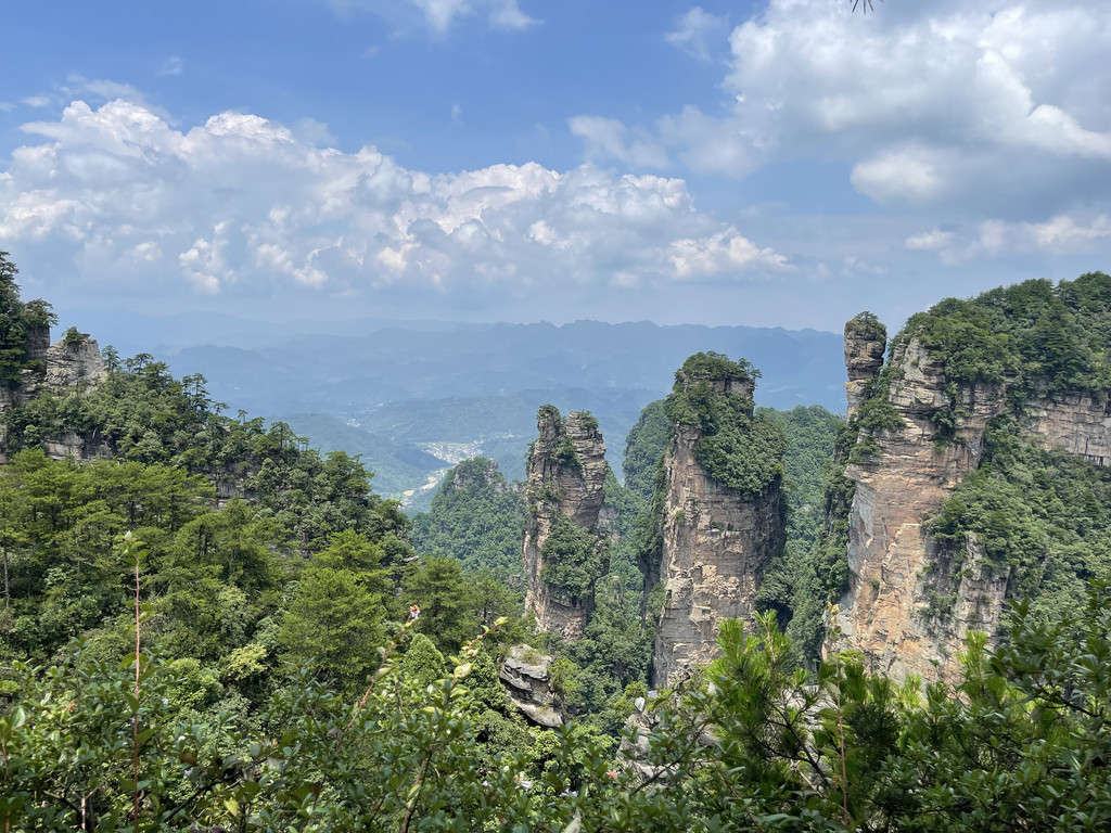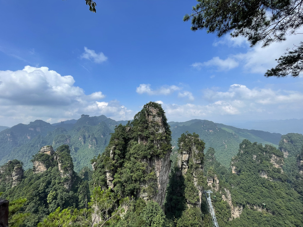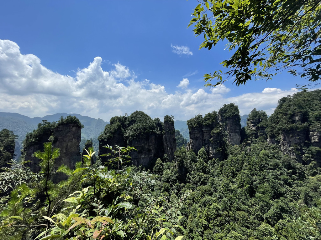这一天的行程要比昨天轻松一些,额,本以为如此。主要游览黄石寨和金鞭溪。需要从南门进(公园内部是没有车直达南门的,外面大巴10元一人,我们是打车去的,50元),下车后,可以在附近的自动售货机买足水(此处两元,公园山下5元,山上10元),排队刷身份证进园后,没多远就是大氧吧了,上环保车前往黄石寨索道下站,索道上山很方便,由于比第一天出发的晚,人也比第一天多了。排队20分钟上索道,山顶上人也比较多,我们选择右手边游览,六奇阁、雷公岩、太子峰、摘星台、双门迎宾、五指峰(此处可以直接转往左侧,往回就是小圈),继续沿右侧情人峰、八卦炉,再往前走下去这一圈需要3个小时,我们从这就回到了五指峰,走到左侧去看了仙女献花、雾海金龟,索道下山了。(这段行程出乎了计划的时间,原以为上面只是一个小圈,没想到若想走全,需要3个多小时,由于之后还需要步行金鞭溪,及时调整了小圈),索道下山后,环保车回到大氧吧,开始啦漫长的金鞭溪之旅,这一天天气晴好,拍的照片也是蓝天白云,但并不会太晒,因为金鞭溪全程几乎都在树荫笼罩之下,这一路除了美景,还有美猴,特别特别多的猴子(千万不要忘了前文的提醒哦,如果要喂猴子,要十分小心,被猴子抓伤就不好玩了),沿途时而水流湍急、时而清溪漫流,伴随着两岸的蝉鸣声声,好生惬意。