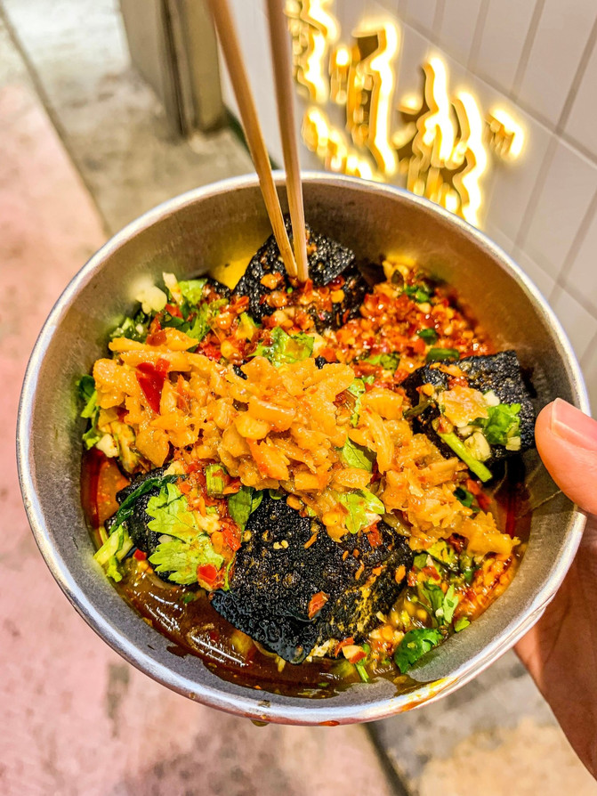 他们家臭豆腐是小粒小粒黑色的。香,辣,还有香菜叶子的加持。