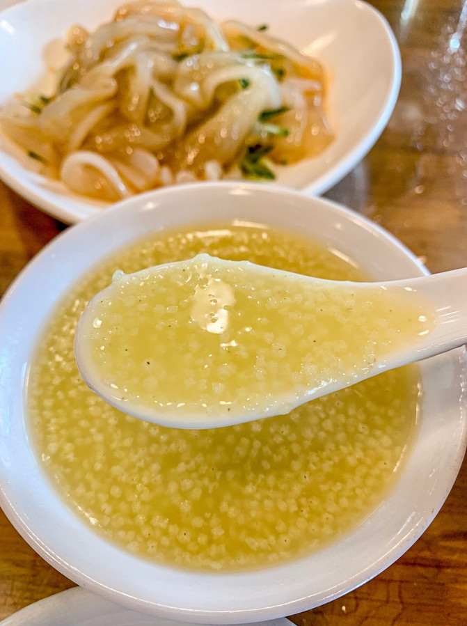 金黄色焦脆的外壳下,包着一团热乎乎烫口的软。一口咬下有点黏牙,边吹边嚼,一碗吃完后,还有点意犹未尽。