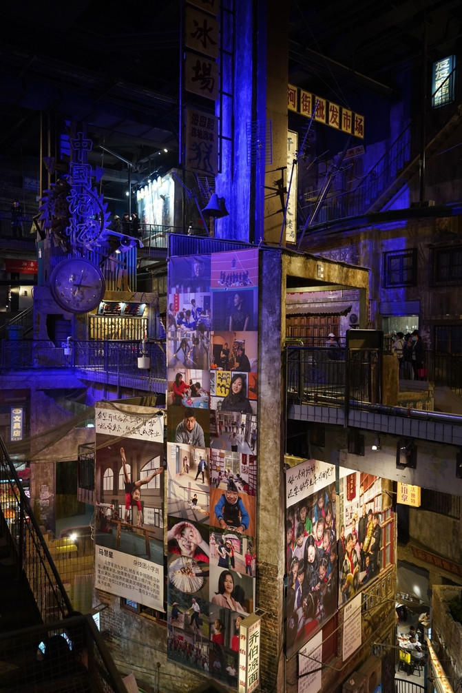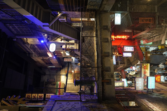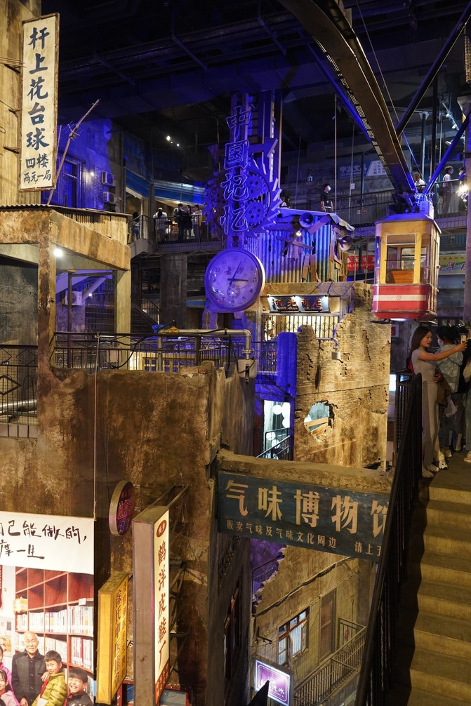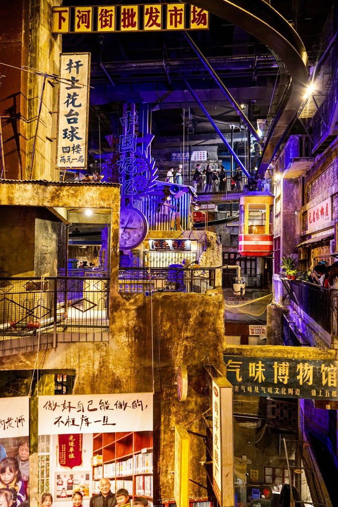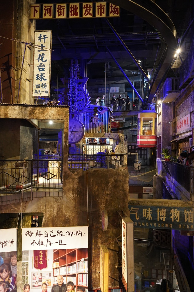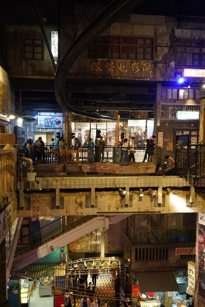 楼层交杂,“鱼龙混杂”的场景。各种各样的老式店铺,巷子,楼道,各种各样的霓虹彩灯,老式招牌。而且这些老式店铺还是营业的,可以在里面买到不一样的东西。