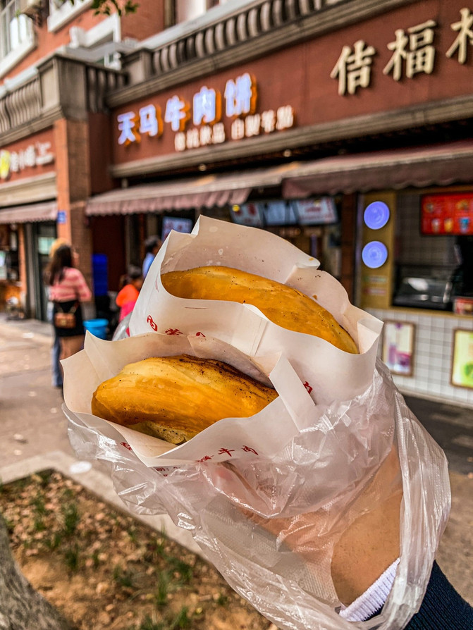 这两家网红小吃店,都在一条街上,是一旦店里的阿姨们制作完毕,就马上有人排队买完一批,就是有真么火。第一个:天马牛肉饼。