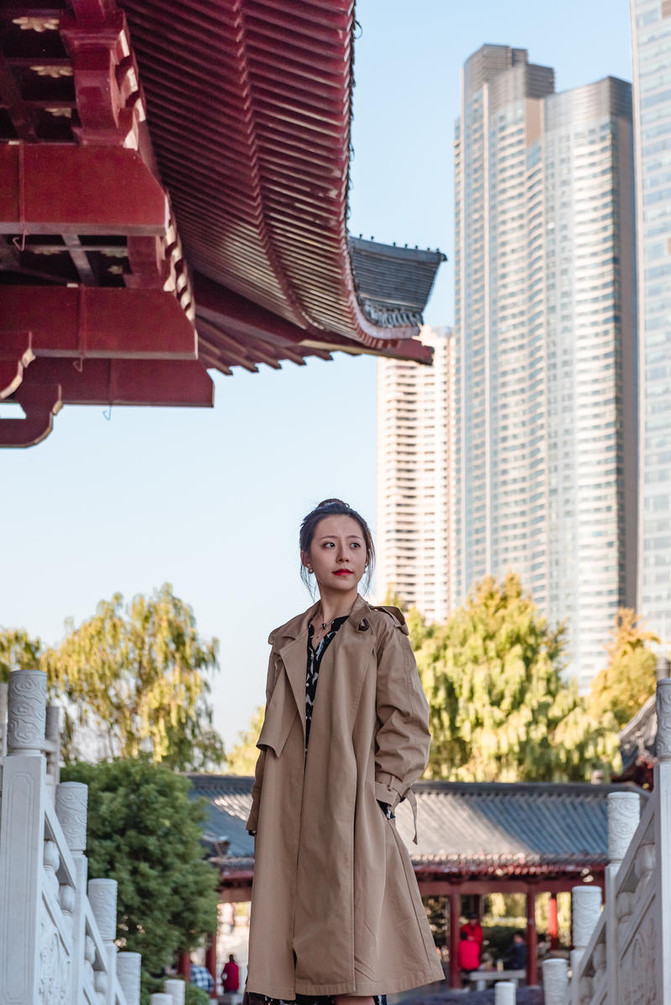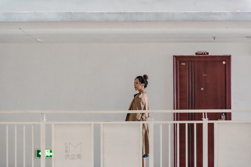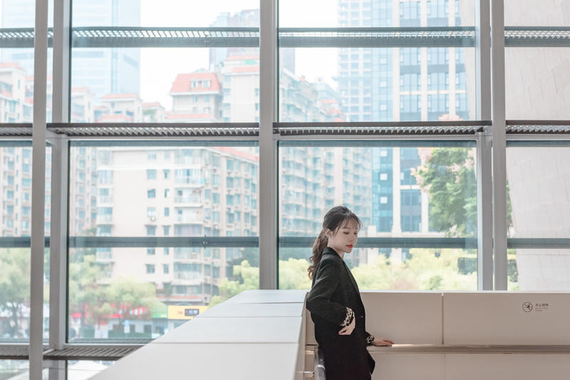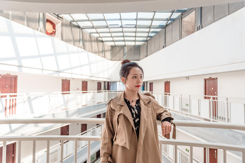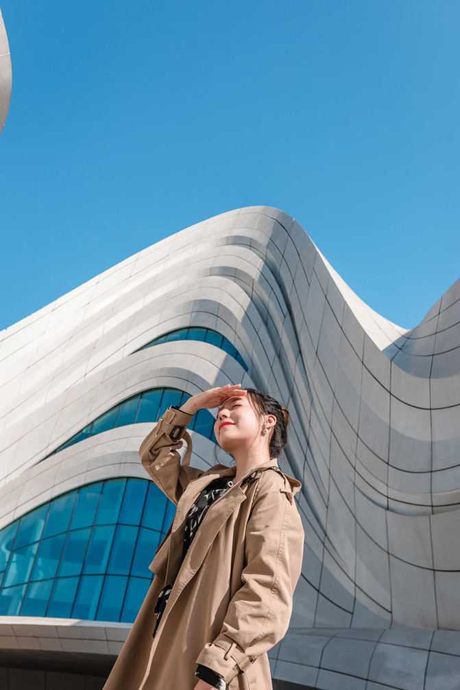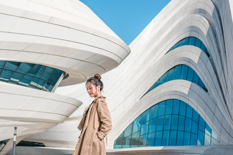 利用大型建筑物构成的一个空洞空间,把人放在空间正中间,相对灵动的姿势都可以,不管是低头还是抬头,不看镜头都可以,人物处于画面中也完美融合在画面中。远景的话,可以用iphone的两倍焦距拍摄或者人像模式。