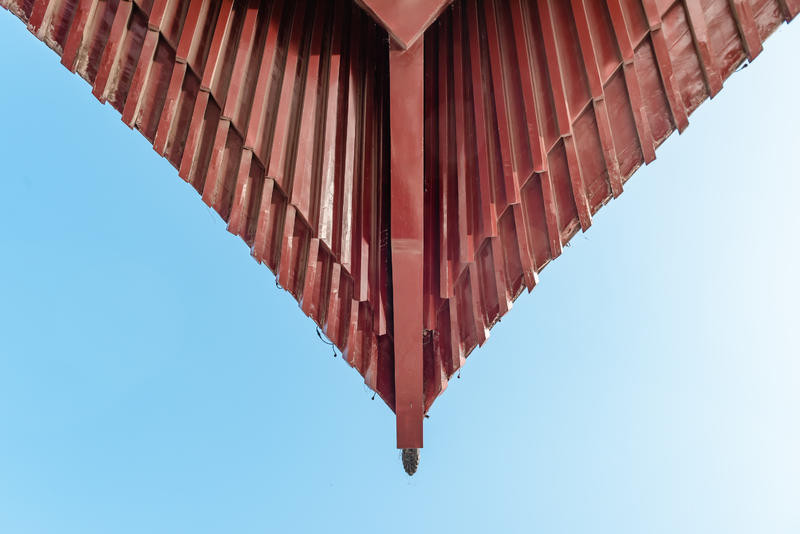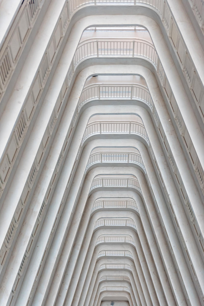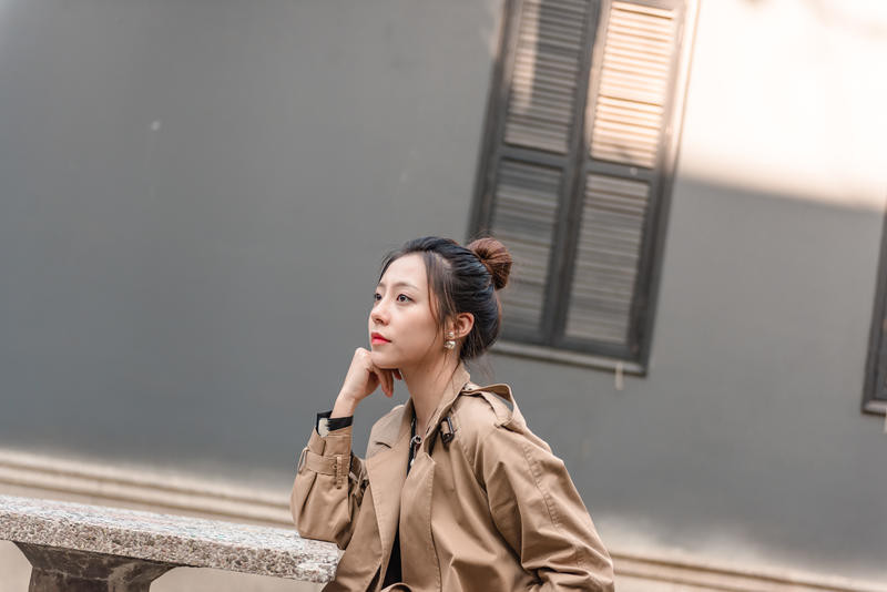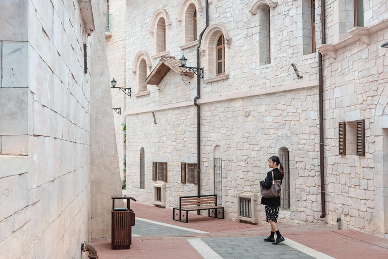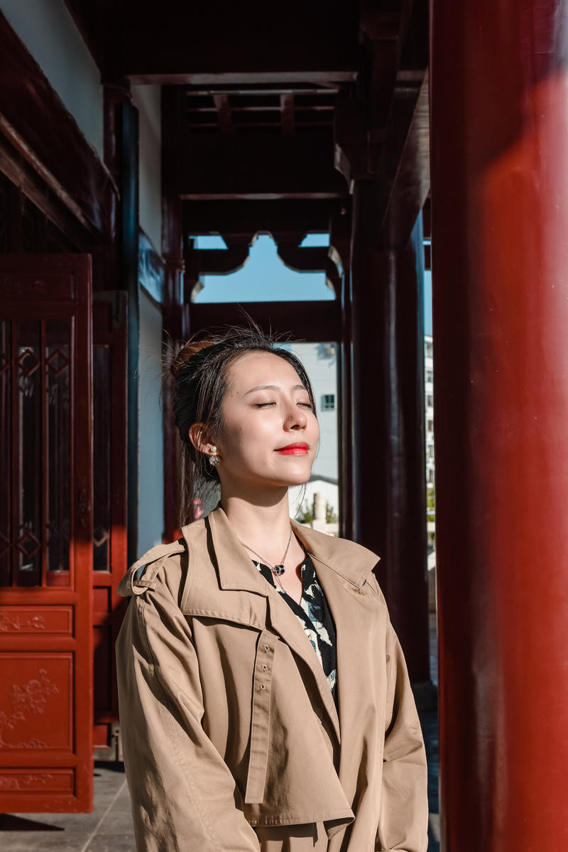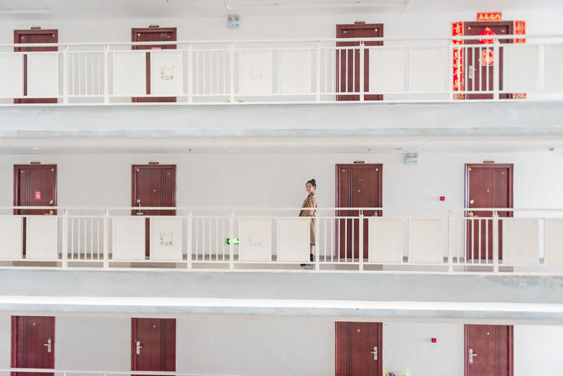 利用大型建筑物构成的一个空洞空间,把人放在空间正中间,相对灵动的姿势都可以,不管是低头还是抬头,不看镜头都可以,人物处于画面中也完美融合在画面中。远景的话,可以用iphone的两倍焦距拍摄或者人像模式。