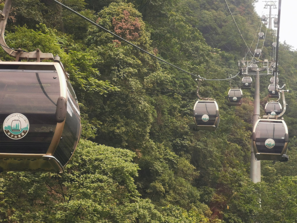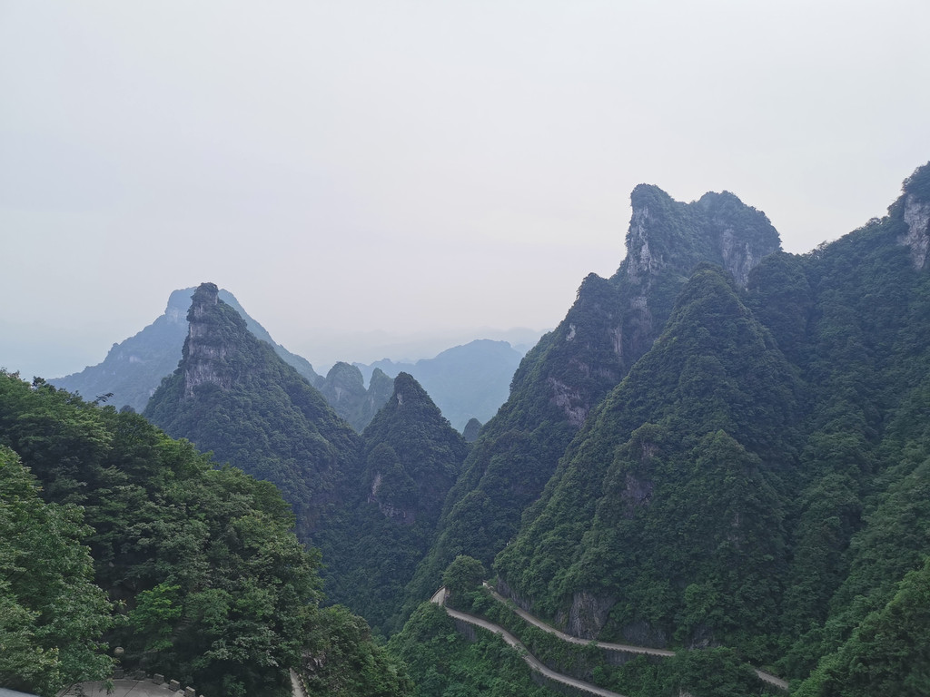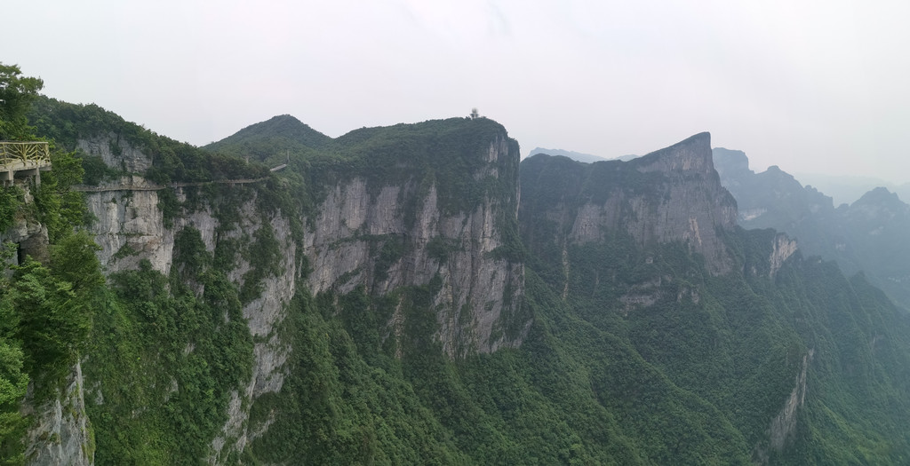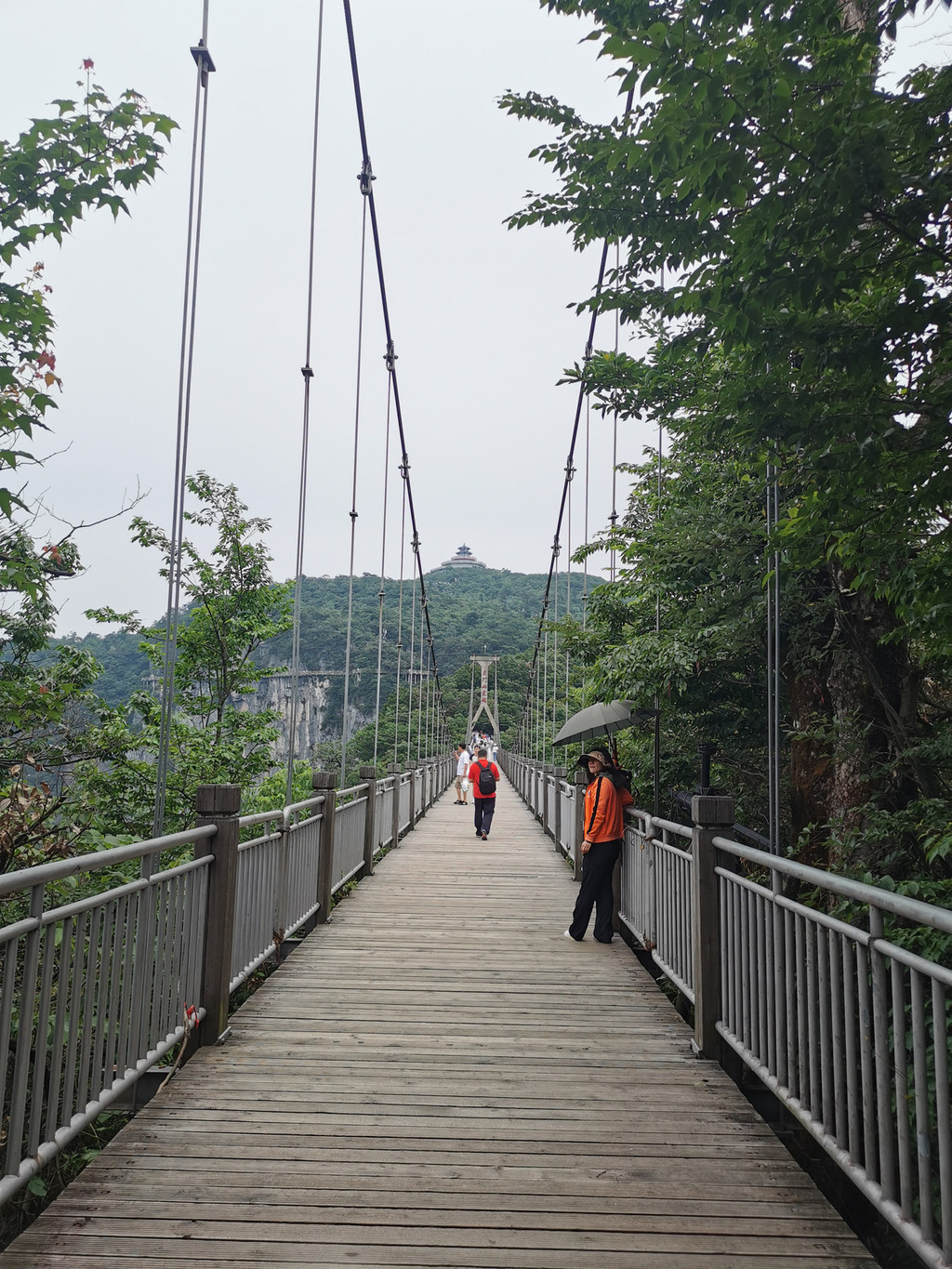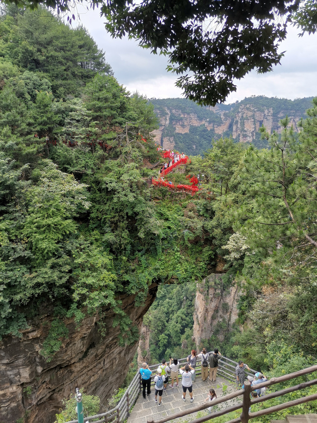 天门山景区。我们选择的B线上山路线,要先在缆车站乘坐景区的观光车,去到上天门洞的快线缆车,到达共有999级的天梯。不想爬楼梯,自费买票搭乘扶梯上去(32元/人),然后再搭乘七级上山扶梯(费用已包含在套票里)上到山顶。我们沿着东环线和西环线整整绕了一周,慢走慢游观景拍照的大概也用了二三个小时。整个山顶游道都比较平坦,没有太多台阶,所以不会太累,最后搭乘山顶缆车离开景区直接下到缆车站,从离开酒店到回到酒店,大约用了五六个钟头。天门山景区大概是全国唯一一个可以从市区直接乘坐缆车到达山顶的,缆车单程用时约二十多分钟,实在是方便得很。整个景区的公共设施都建设和维护得比较好,不愧是5A级景区。