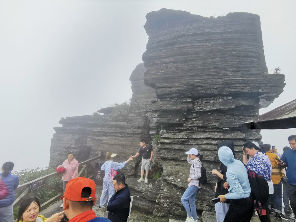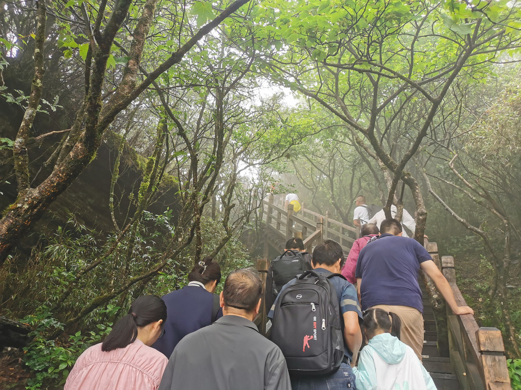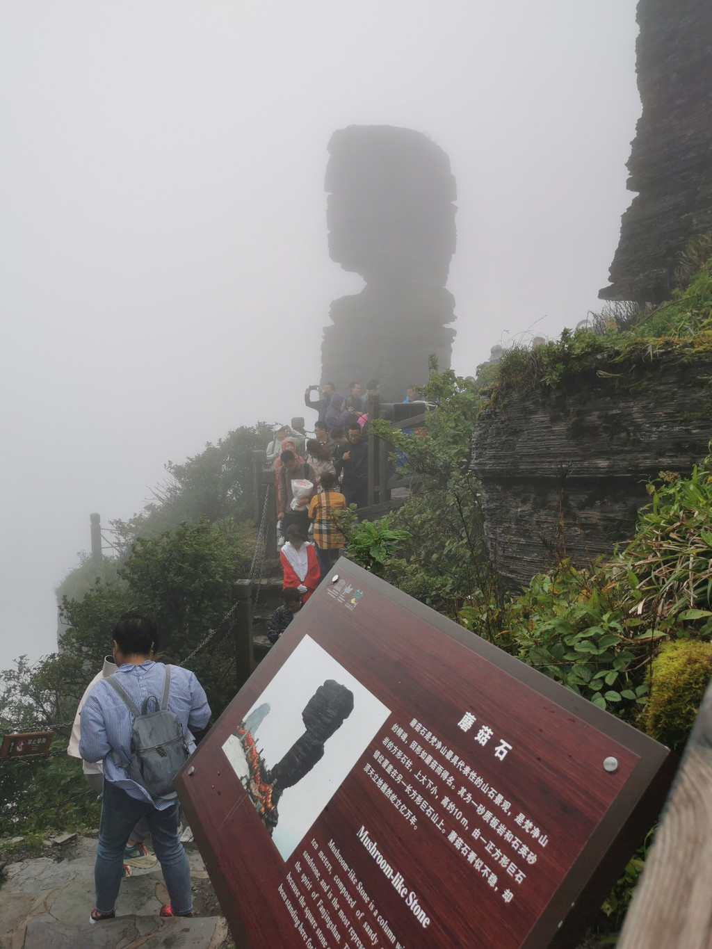 梵净山是贵州省的新晋的国家5A级景区,常年雨雾缭绕,难见晴天。景区内有缆车上下山,但只能坐一截儿,仍需步行七八百米才能上到半山腰的蘑菇石。从蘑菇石再往上必须手脚并用才能爬上老金顶和红云金顶。因上下山的步道狭窄陡峭,容量有限,所以景区每天限制游客量仅为八千人。我们运气欠佳,也是遇到雨雾缭绕的天气,山上能见度极差,且狂风大作似乎能将人吹跑,最后只能放弃登顶,在蘑菇石处返回。