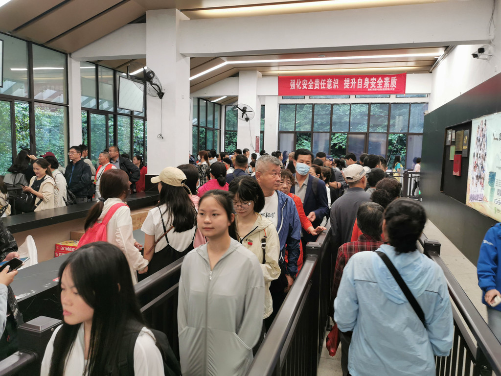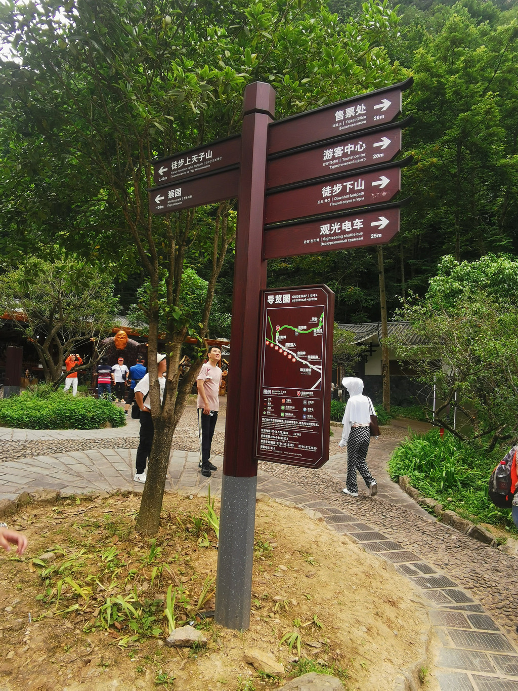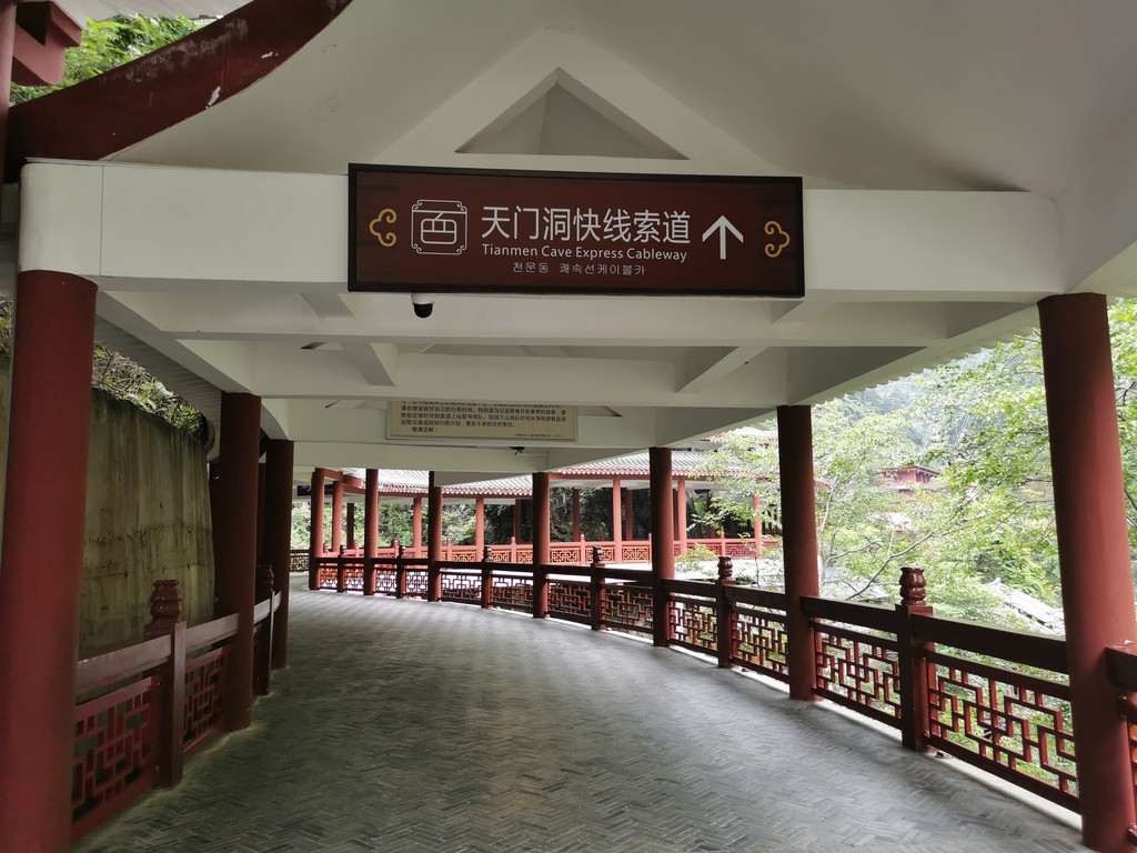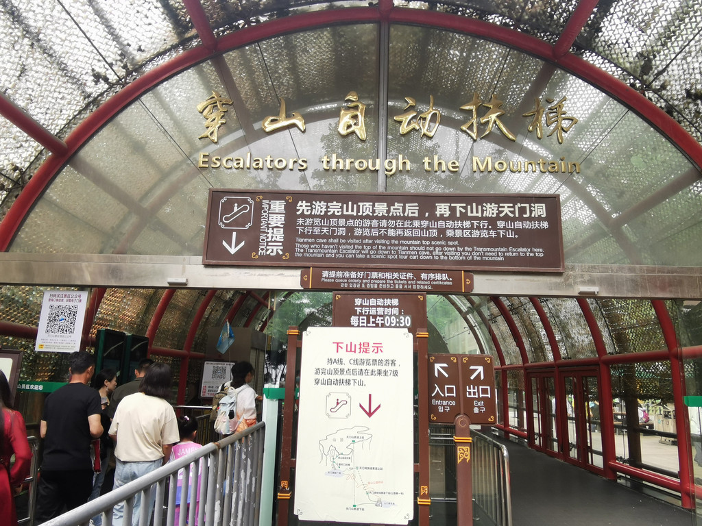 我们走B线上山的从这里出来,走A线的要从这里搭乘自动扶梯下山。所以入口处有提示说,要先游完山顶景点(即东西环线),再下山游天门洞。