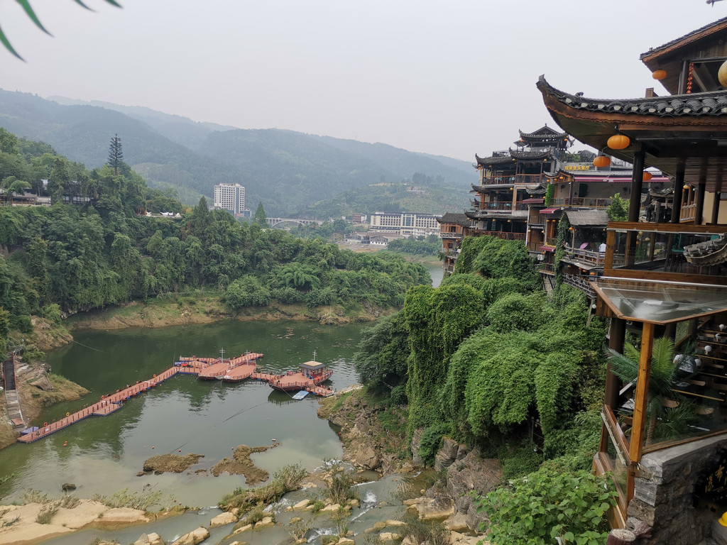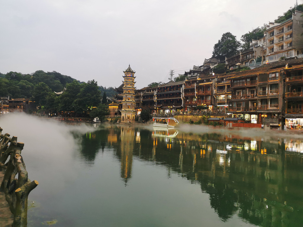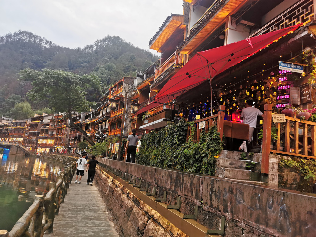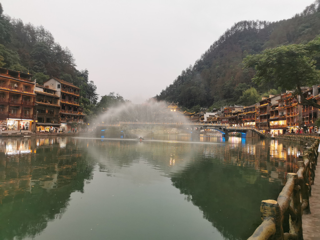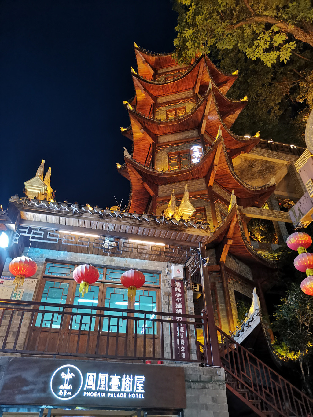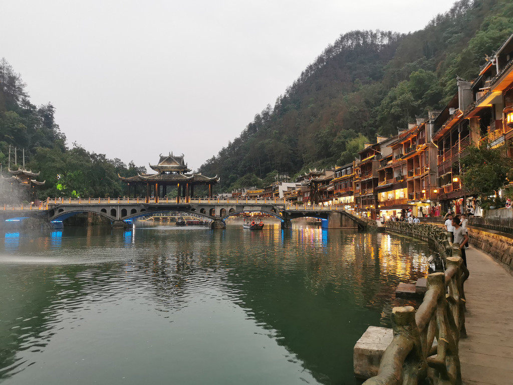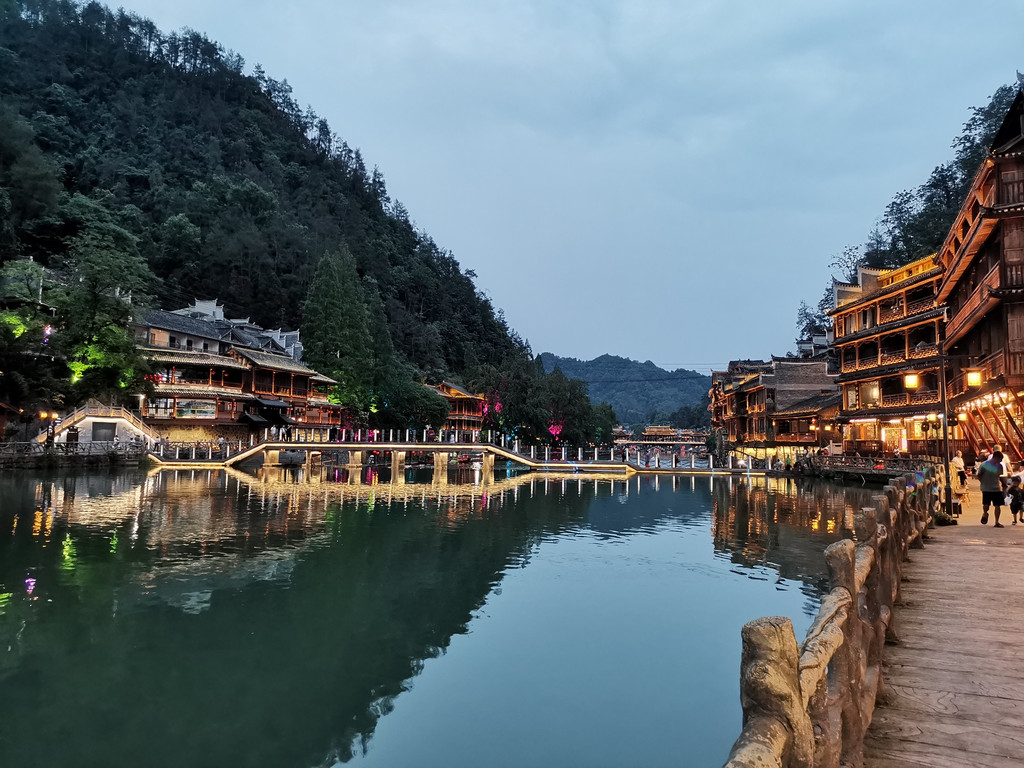 傍晚到达凤凰古城的诚云悦夕度假酒店。这家酒店位置很好,离凤凰古城步行约七八分钟可达。到达酒店时前台美眉特意出来为我们引导停车,退房时还赠送了伴手礼。进房间后的第一感觉是房间很大很舒服,但是用起来感觉有点不方便,洗手台和坐厕在房间的一侧,淋浴间则在房间的另一侧,拿个浴巾毛巾的,还得两头跑。其它方面还是挺不错的。