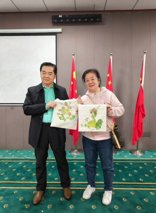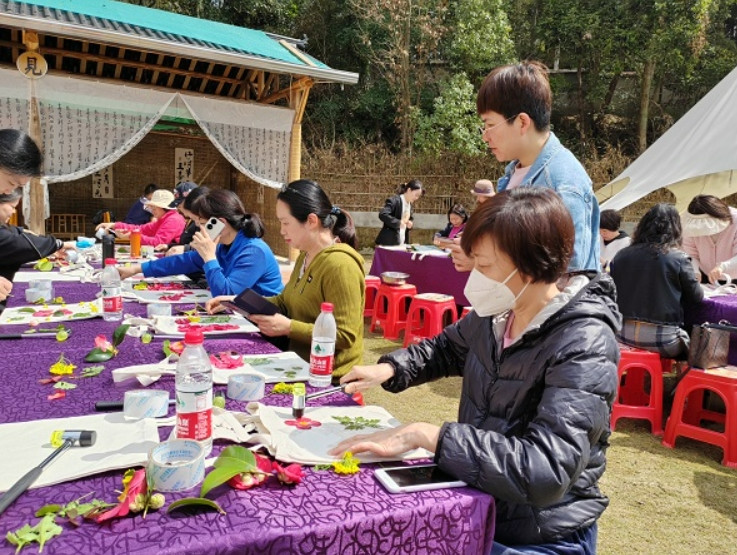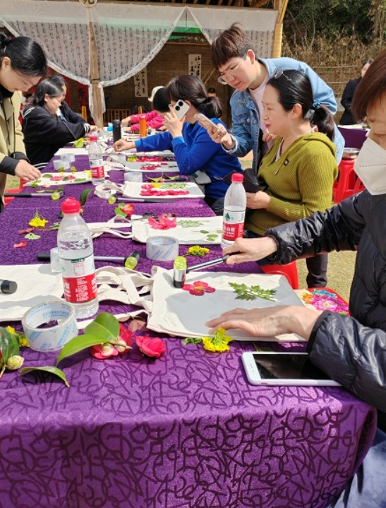工作人员提前准备需要的工具(拓染减震锤、拓染减震板、剪刀、胶带、帆布手提袋)及植物和花