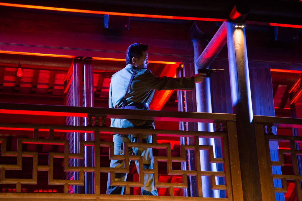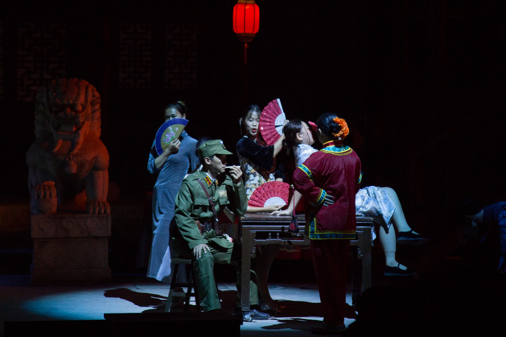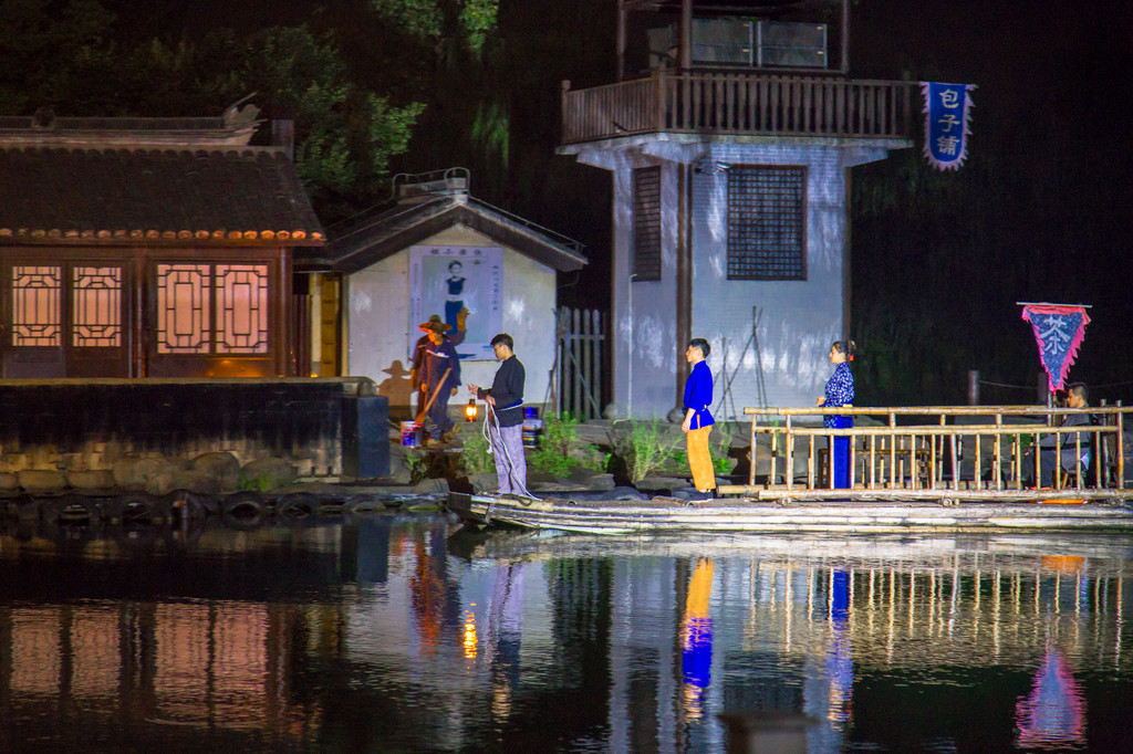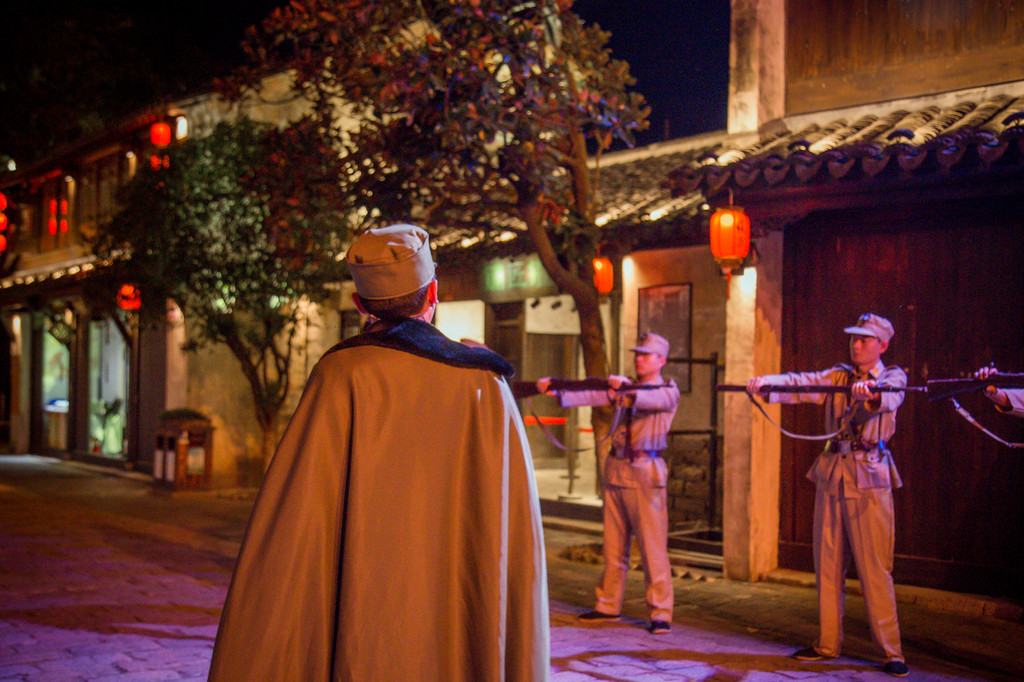 《芦荡夜色》是以横泾老街为主要演出区域,结合沙家浜经典抗战故事和民国风情文化,由多个不同场景组合而成,游客走在其中,是观众,也是演员,在旁观,也在参与。