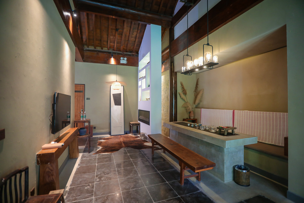 幸运的我入住到了一号东屋那院。走在青石板小路上,眼前粉墙黛瓦的江南民居,正是梦中的小院,推开古朴的木门,不管是装修风格还是家具摆饰,满满的都是年代感!民宿的公共空间,有泳池,沙坑,兵乓球桌,别墅里还有茶吧,棋牌桌等,适合大家庭活动,朋友聚会!