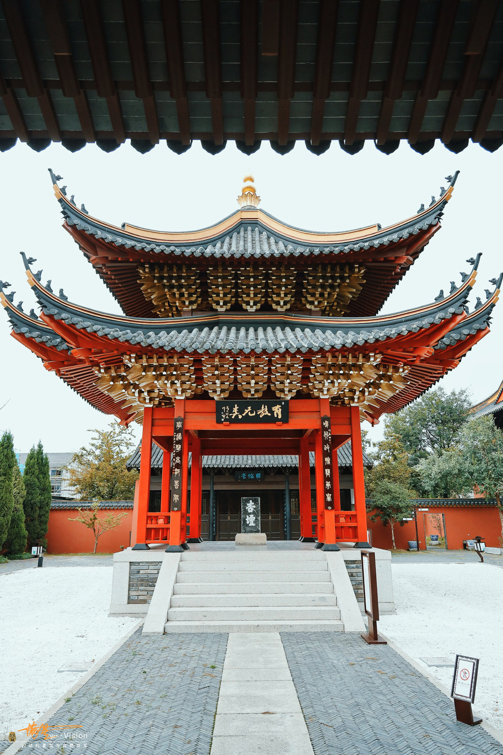 进入参观,最吸引我的还是建筑,这里最具特色的就是顶部古色古香的梁架,中间为前后双步梁,形状如月亮,曲线柔和。上下檐都采用斗拱,这些斗栱不仅硕大,而且做法繁复,其设计施工都严格遵照北宋时期《营造法式》中的形制进行。完工后的建筑出檐深远,整体庄严雄伟、古朴大方,体现出苏州传统“香山帮”营造工艺之精妙。