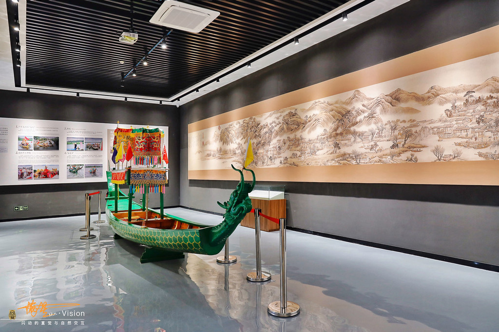 龙舟博物馆分为历史传承、地方习俗、龙舟工艺三个大主题,三个空间内形成起源总述、李王传说、巡游盛况、非遗传承、竞渡妙影、习俗礼记、工艺传承和美好留念8个展厅来进行展示。以图文以及多媒体设备场景再现展示龙舟的制作以及龙舟会的盛况,非常震撼!