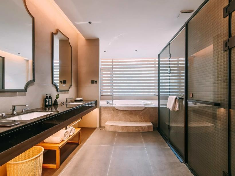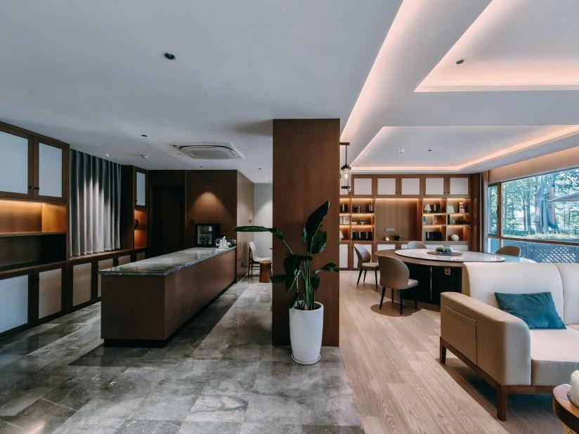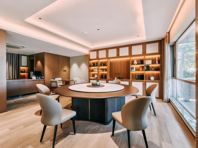 酒店设计以“苏式国风”为灵感,融入江南特有的空间格局与文化元素,犹如一座隐居于山水之中的苏式府邸桃源,室内外都充满着中式古香气息。我入住的是静晖豪华套房,房间设计同样是江南苏式风情,原木古香之中,家具、灯饰、挂画等呈现出浓浓雅致。
