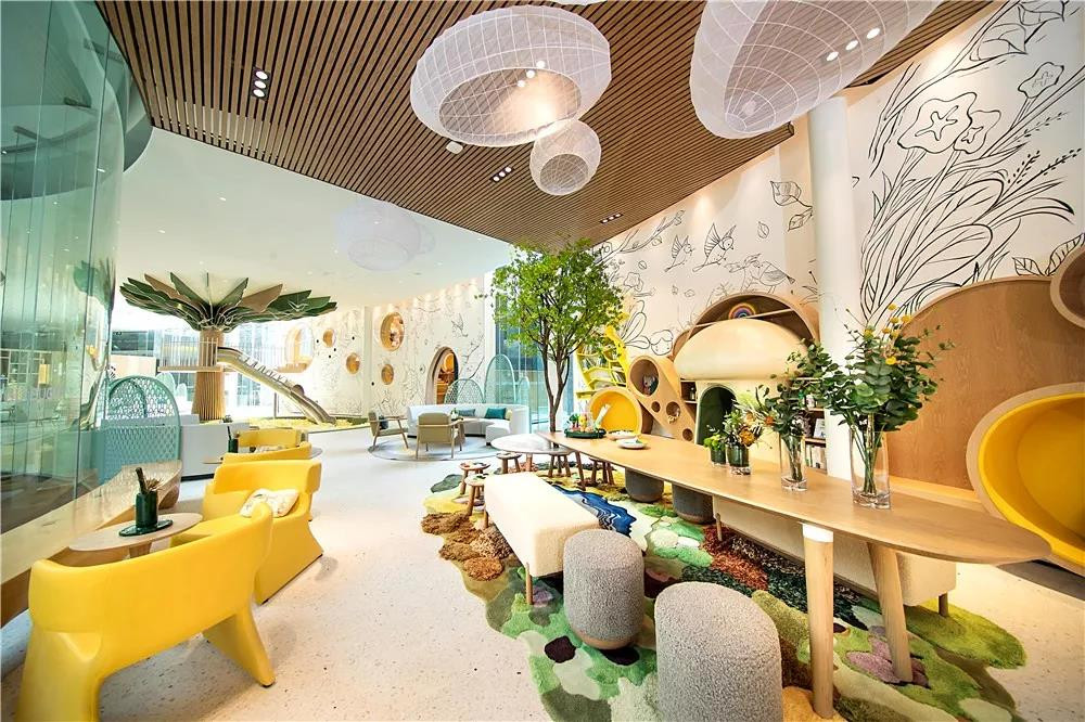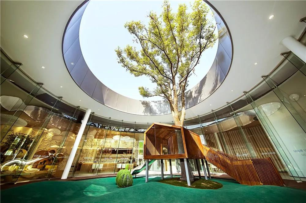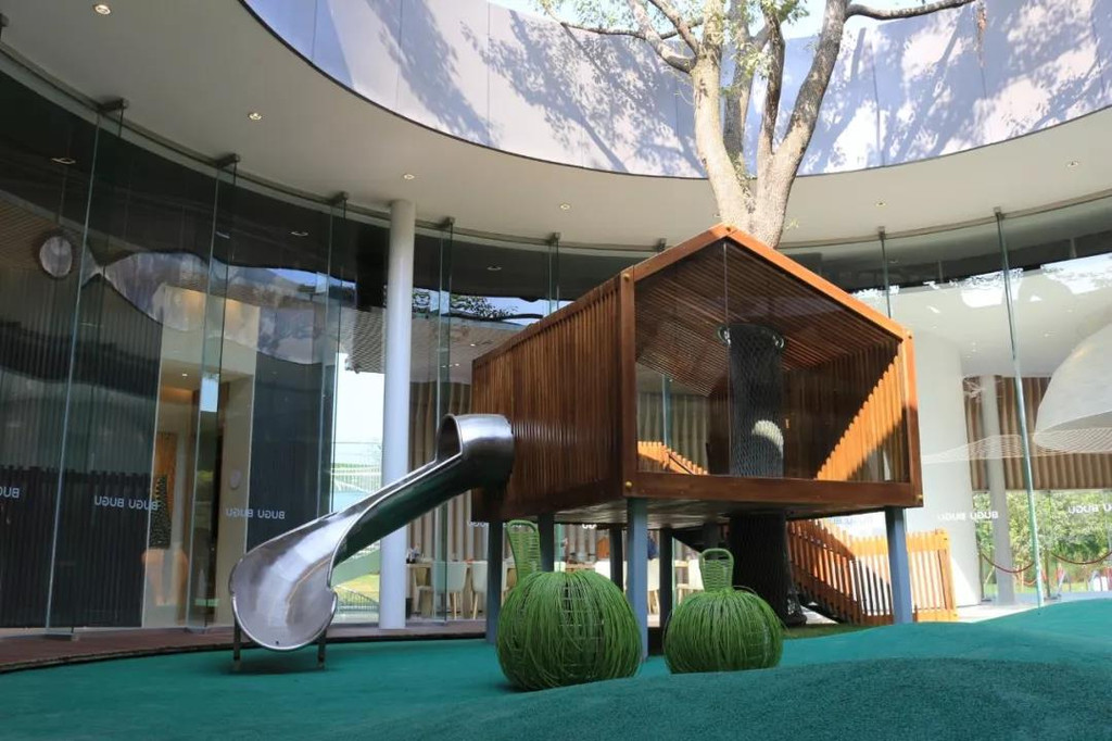 海洋球正对的是一个树屋空间,这也是小巨蛋中心的一个独特的采光口,小朋友可以爬到树屋内坐滑滑梯下来。
