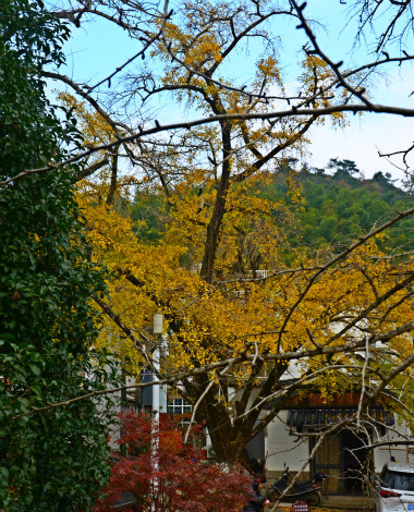 一树独艳。其他银杏树的叶子都已凋谢,唯独这一棵枝繁叶茂。