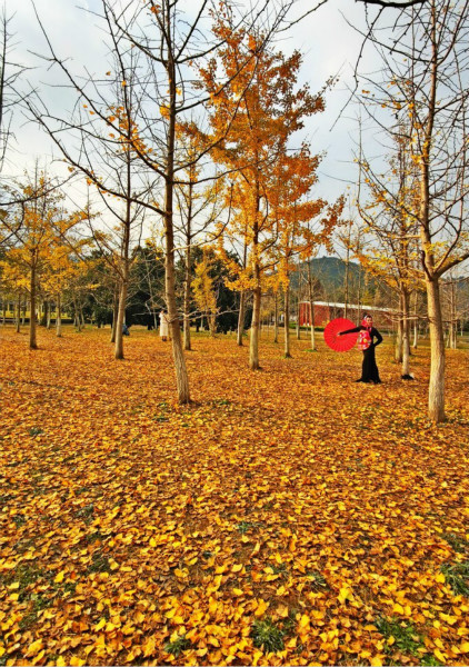 广袤的银杏林,一些资深美女拿着道具,摆这POSE.