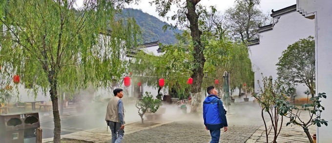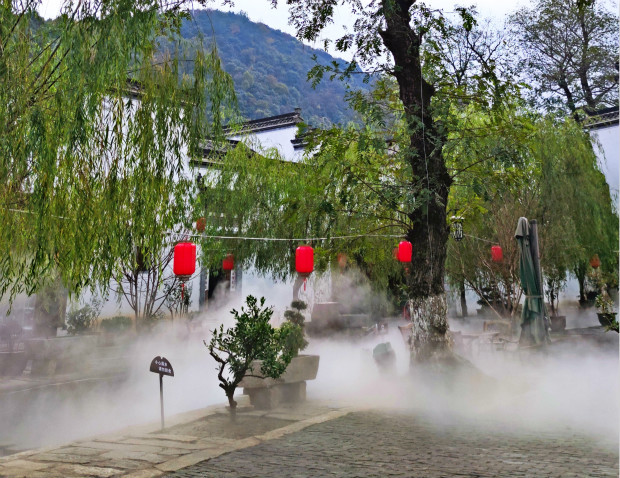 方子村入口,假山中释放出薄薄的烟雾,营造出如梦如幻的仙境。