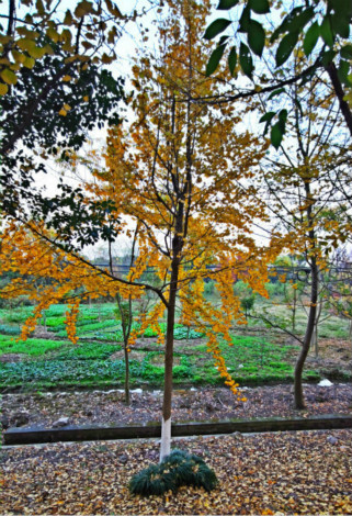 铁路两边的银杏树都是瘦瘦的,树叶也不多,不成规模。