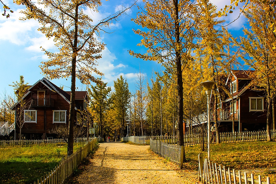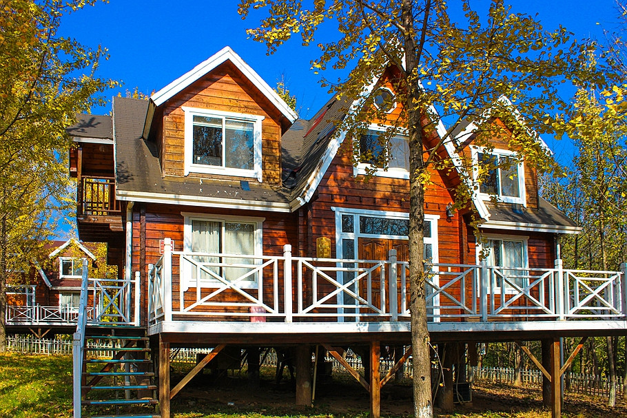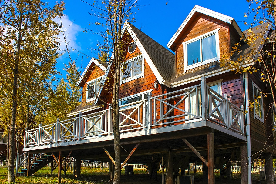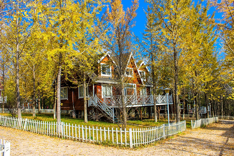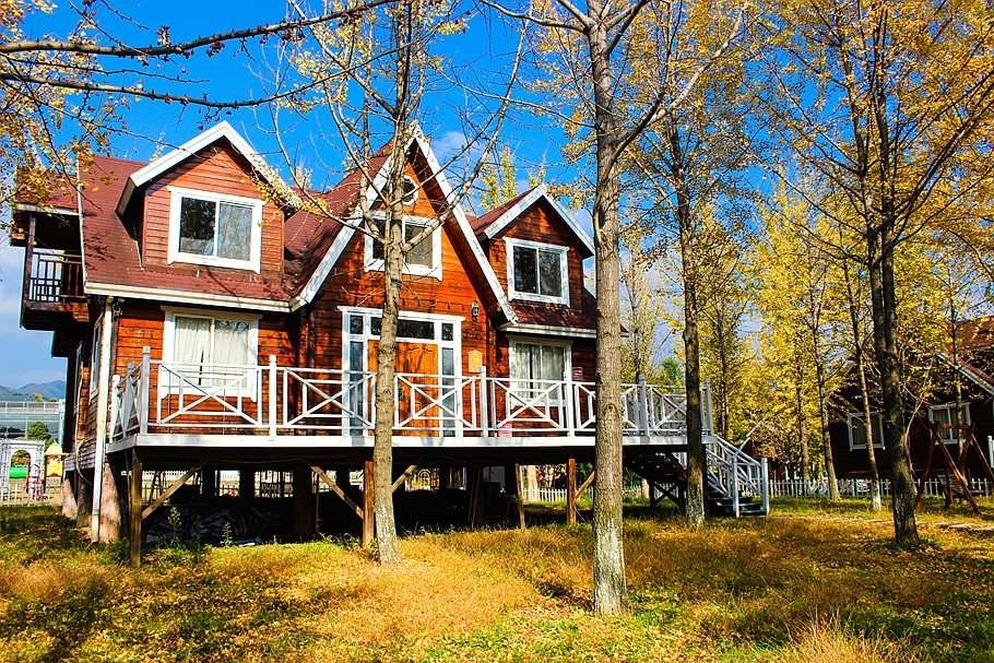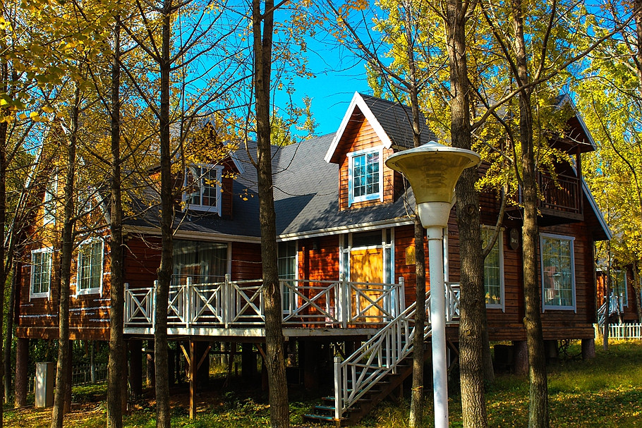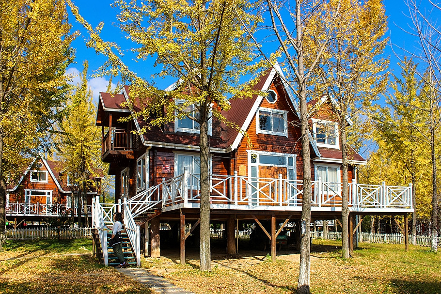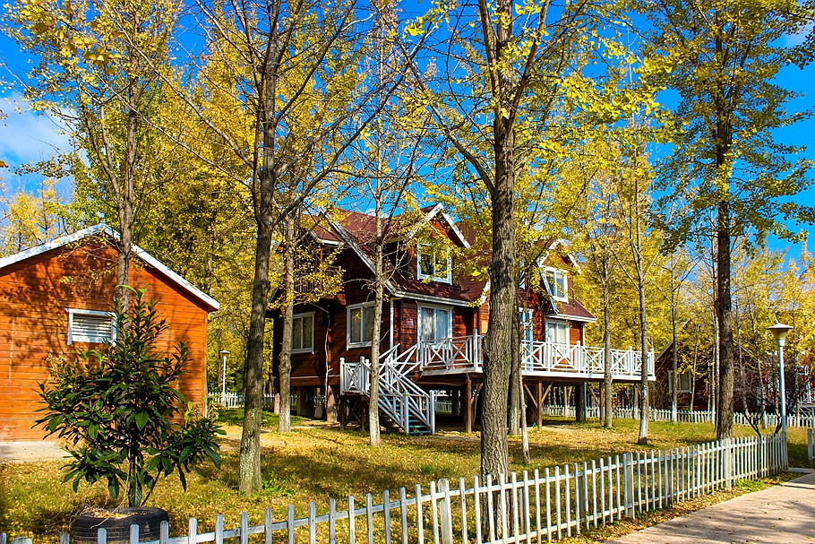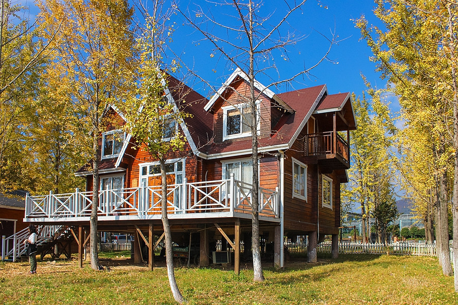 银杏树林间,一幢幢随坡就势的欧美风格独立木屋吊脚别墅,仿佛置身于一座欧美乡村。