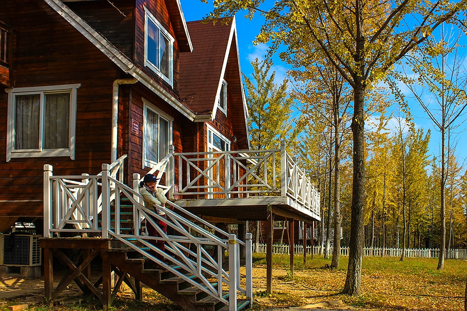 来长兴果圣山庄赏银杏也是不错的选择,这里木屋吊脚别墅隐于百亩银杏林之中,别有一番怡然自得。